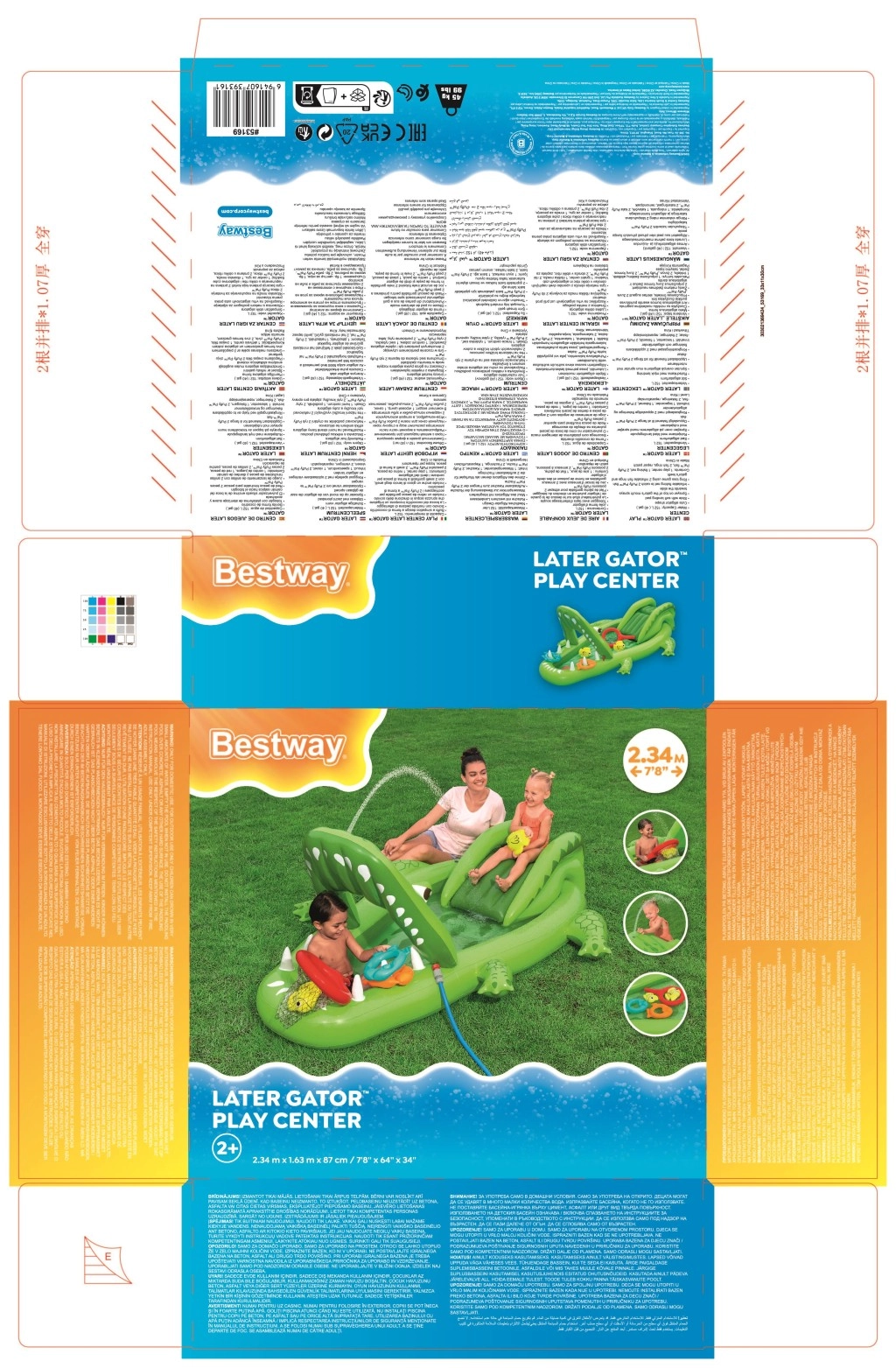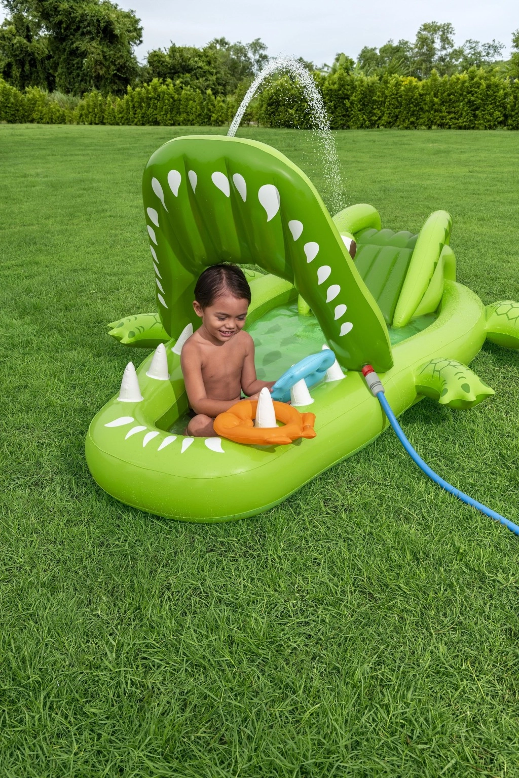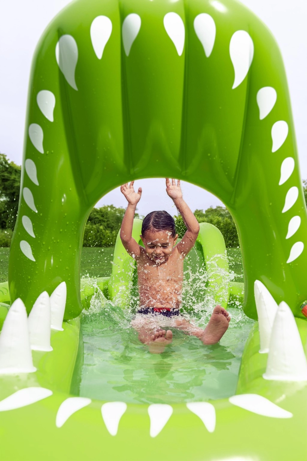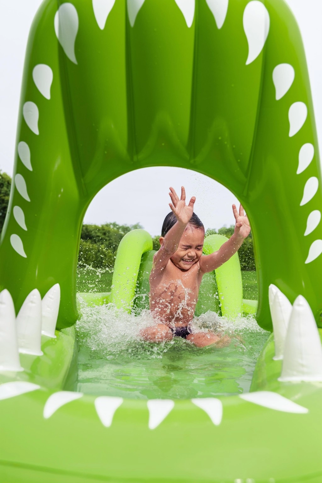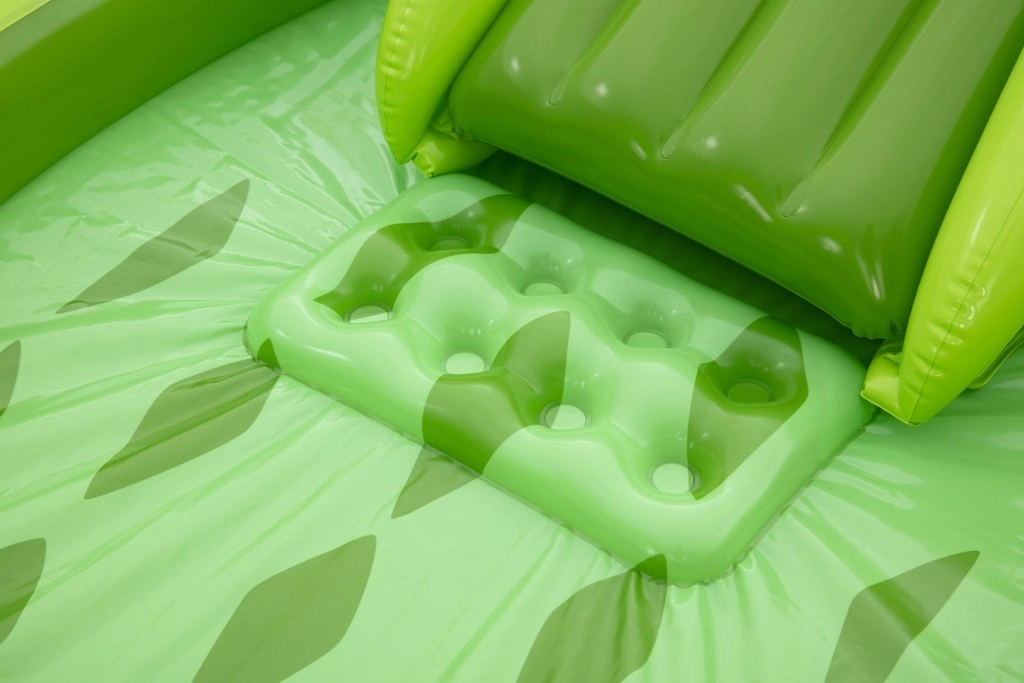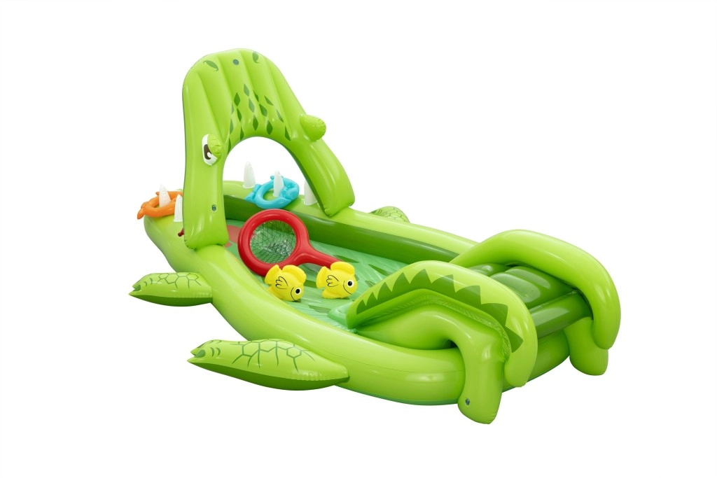 To nadmuchiwane centrum zabaw w kształcie aligatora zapewnia dzieciom godziny aktywnej rozrywki w ogrodzie. Realistyczny design z „paszczą–bramą” zachęca do zabawy, czołgania się i zjeżdżania, a wodny zraszacz podłączany do węża ogrodowego tworzy delikatny prysznic skierowany na zjeżdżalnię dla lepszego poślizgu i ochłody.