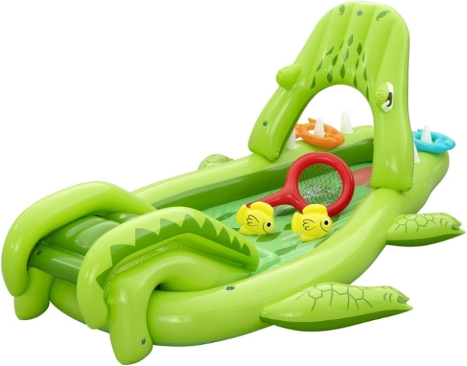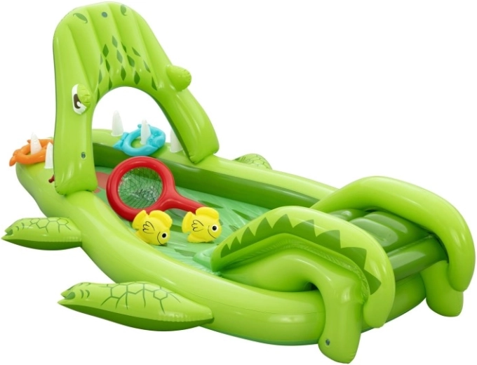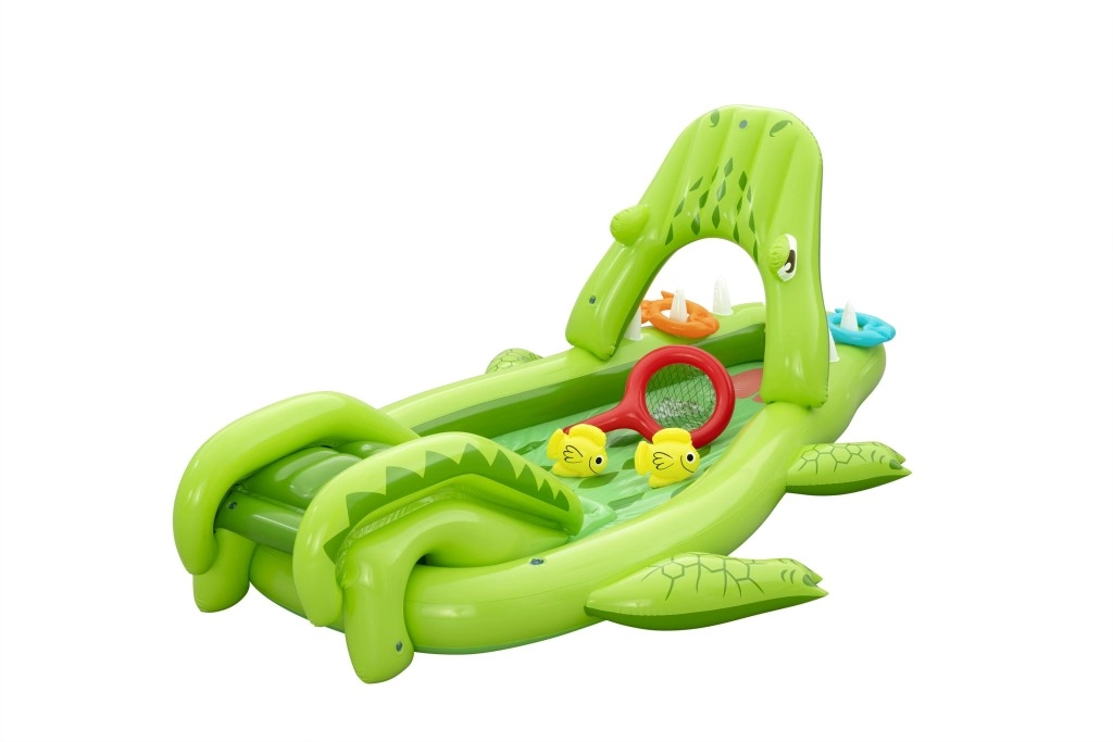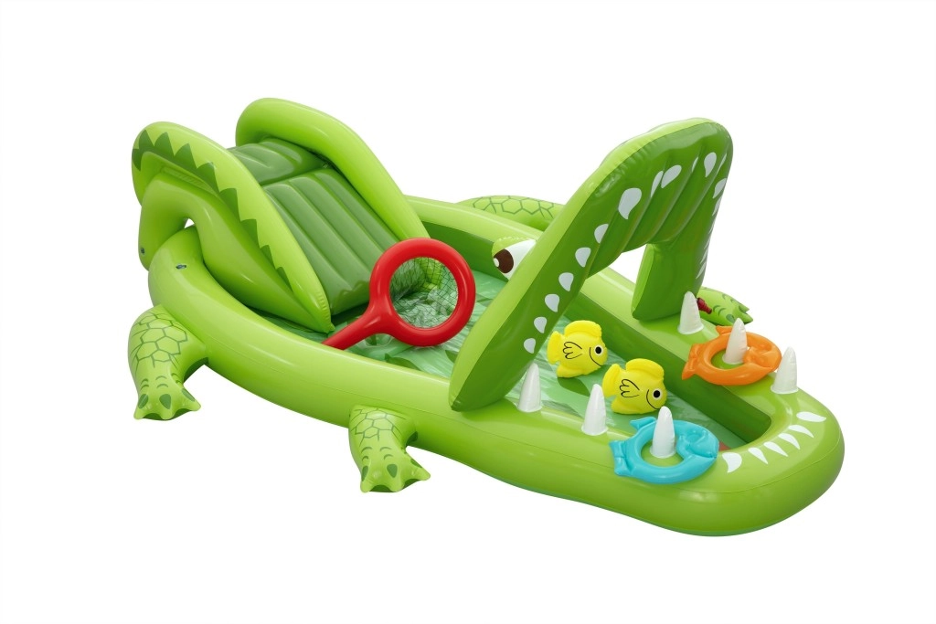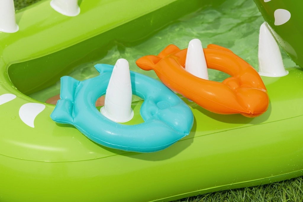 Bezpieczeństwo i wygodę zapewniają miękkie dmuchane ścianki oraz wyściełana strefa lądowania pod zjeżdżalnią. W zestawie znajdują się akcesoria do gier zręcznościowych – dwie rybki, dwa dmuchane kółka „rybie” oraz podbierak, dzięki którym dzieci trenują koordynację, łapanie i rzucanie kółek na „zęby” aligatora.