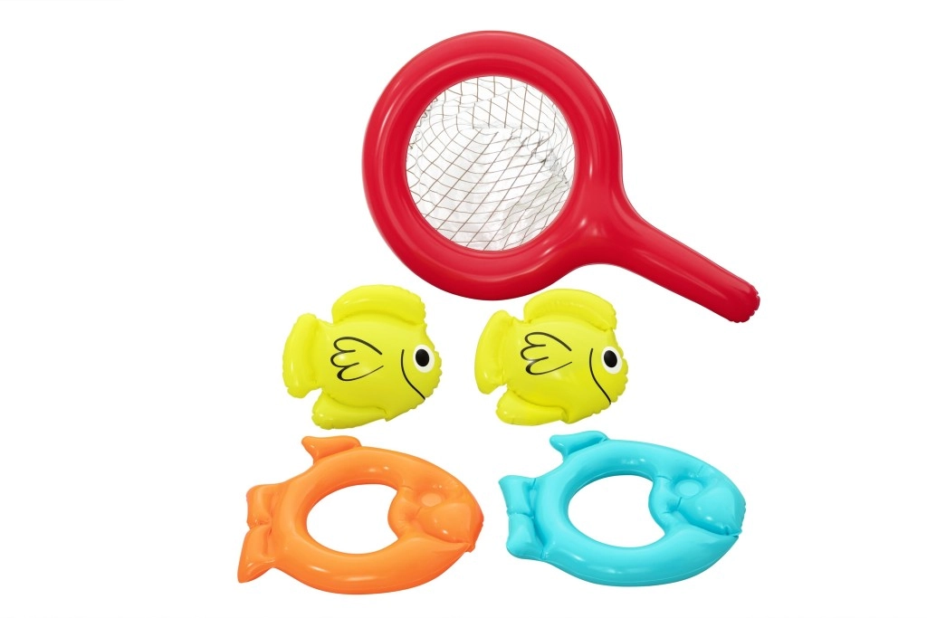 W zestawie są dwie rybki, dwa dmuchane kółka i podbierak. Dzieci mogą łapać, przerzucać i trafiać do celu, rozwijając małą motorykę.