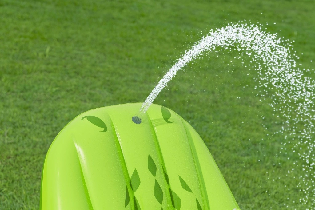 Zintegrowany zraszacz na „głowie” aligatora po podłączeniu do węża ogrodowego tworzy delikatny strumień skierowany na zjeżdżalnię – dzieci zjeżdżają łatwiej i pozostają w chłodzie.