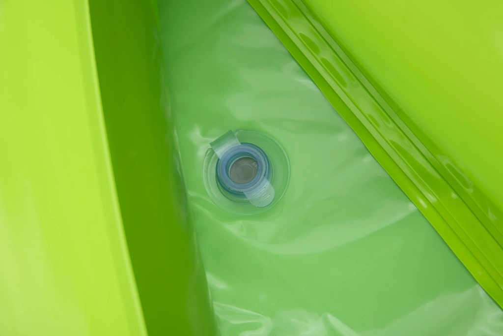 Żebrowana powierzchnia i dmuchane boczne ścianki zwiększają komfort i pewność podczas zjazdu, a miękka strefa lądowania amortyzuje kontakt z płytką wodą.