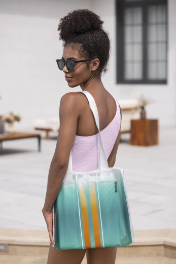 - cyjanowy gradientowy nadruk (leżak i torba)
