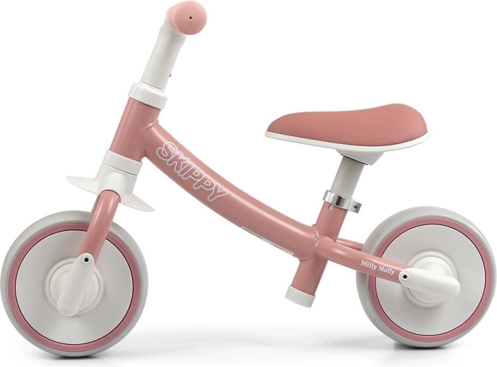 Leciutki dziecięcy jeździk biegowy MILLY MALLY Skippy w różowo‑białej kombinacji pomaga dzieciom rozwijać równowagę i koordynację od najmłodszych lat. Ma szerokie, pełne koła EVA odporne na przebicie, miękkie profilowane siodełko z regulacją wysokości, antypoślizgowe chwyty oraz ogranicznik skrętu kierownicy dla większego bezpieczeństwa. Wytrzymała stalowa rama i kompaktowe wymiary zapewniają wygodę w domu i na zewnątrz.