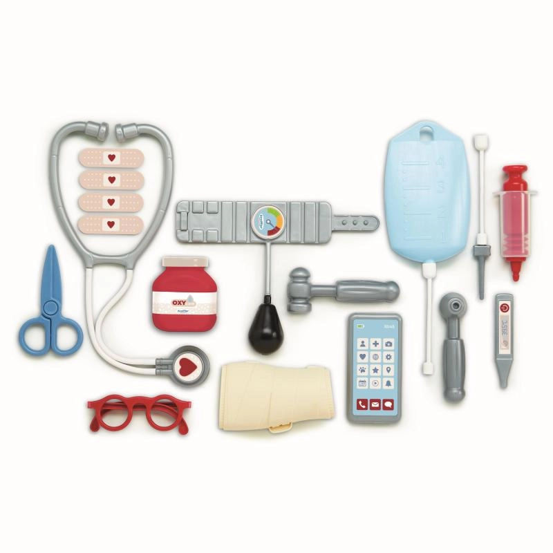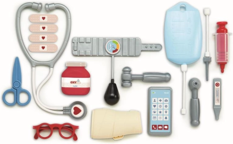 - 17 szt. (stetoskop, okulary, telefon, ciśnieniomierz, otoskop, młoteczek neurologiczny, butelka na leki, termometr, worek infuzyjny, strzykawka, gipsowa orteza, nożyczki, 4× plaster)