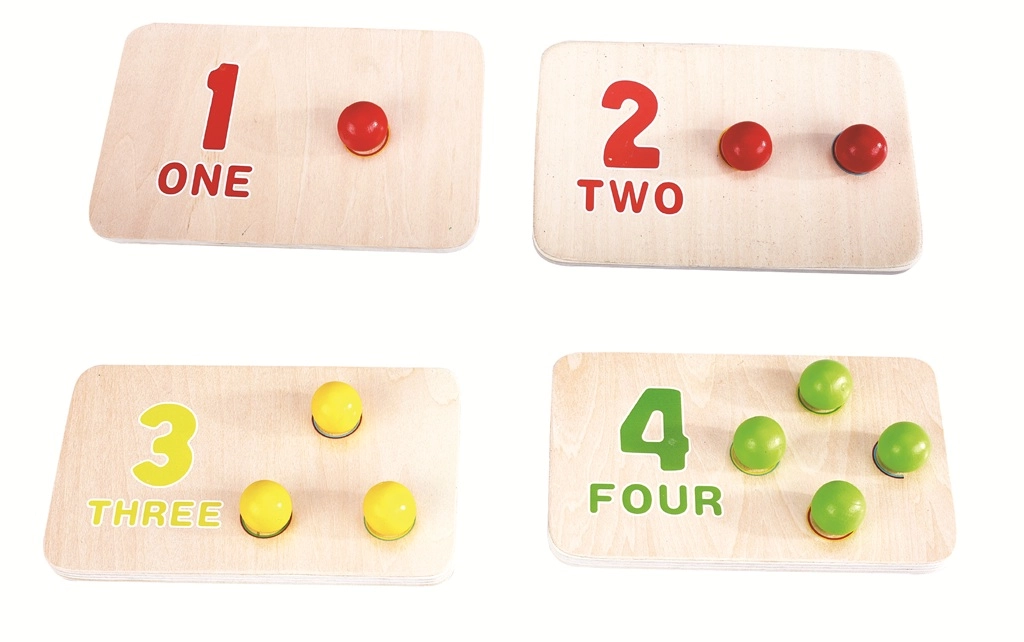 Każda tabliczka przedstawia liczbę oraz odpowiadającą jej liczbę otworów na kołeczki/kulki. Dzieci w naturalny sposób łączą cyfrę z ilością i trenują motorykę małą.