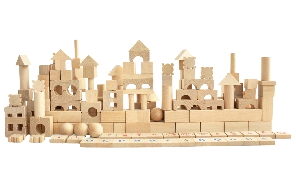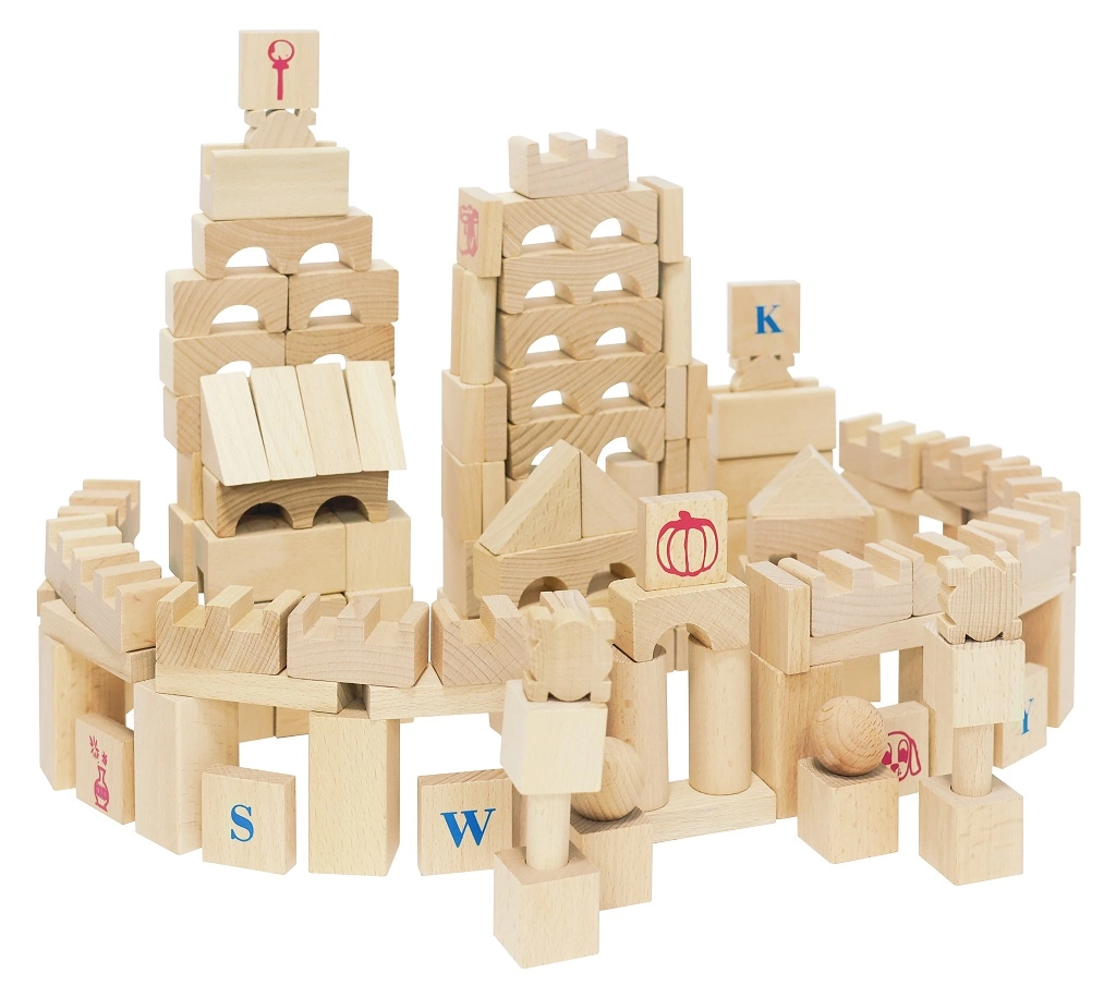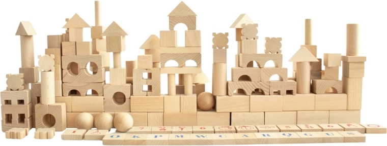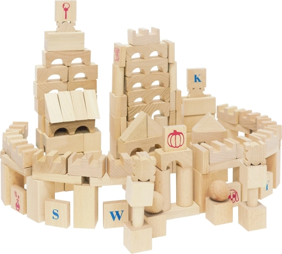 Odkryj ponadczasową zabawę z dużym zestawem naturalnych drewnianych klocków. Dzięki 220 różnorodnym kształtom dzieci z łatwością zbudują zamki, wieże, mosty i całe miasta. Gładka powierzchnia i staranne wykończenie gwarantują bezpieczną zabawę, a litery, cyfry i symbole na wybranych elementach wspierają naturalną naukę poprzez zabawę.