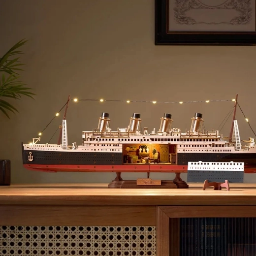 Ta designerska zestaw DIY oferuje realistyczny model legendarnego liniowca o wiernych proporcjach, z czterema kominami i bogato odwzorowanymi pokładami. Dzięki zdejmowanemu panelowi bocznemu możesz zajrzeć do kabin i korytarzy, a ciepłe oświetlenie LED podkreśla detale wnętrza i zewnętrza. Po złożeniu model stanowi stylową dekorację do salonu, gabinetu lub pokoju studenta.