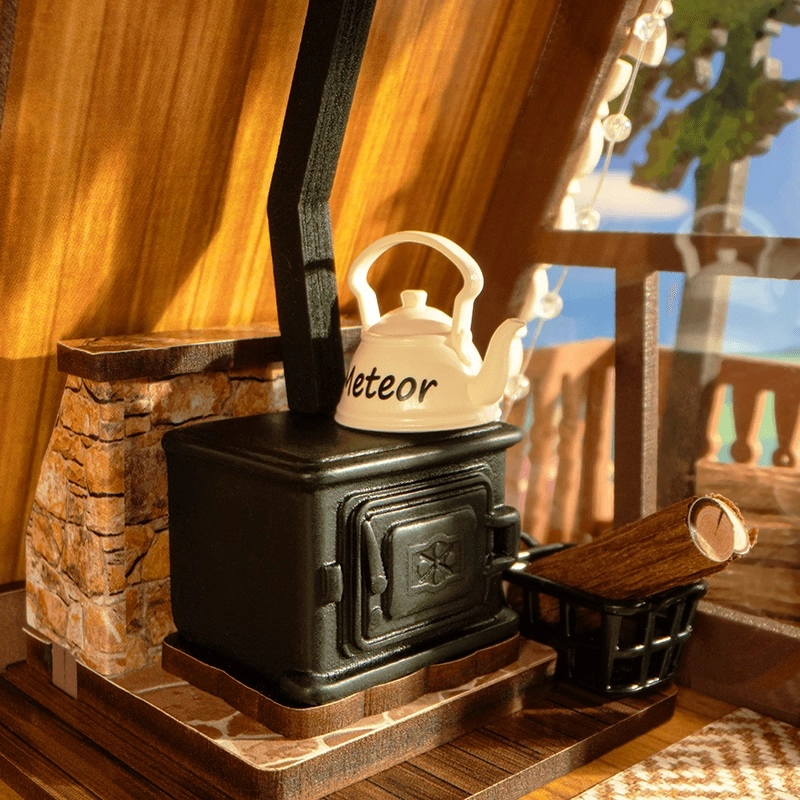 Stwórz atmosferę nowoczesnego glampingu we własnym domu. Model chaty z dachem dwuspadowym zachwyca dużymi przeszklonymi ścianami, otwieranym oknem i przemyślanym wnętrzem: słoneczny salon, w pełni wyposażona jadalnia, drewniane schody i sypialnia na poddaszu. Nie brakuje balkonu z miniogródkiem, drewnianego pieca, dekoracyjnych ramek ani gitary – każdy detal ucieszy miłośników miniatur.