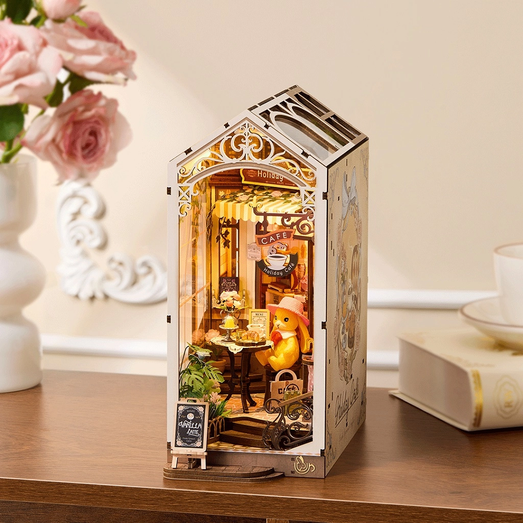 Ta dopracowana w detalach miniatura przenosi atmosferę przytulnej wakacyjnej kawiarni prosto do Twojej biblioteczki. Otwarta konstrukcja z szerokimi bocznymi oknami, realistyczne dodatki i ciepłe podświetlenie LED zamienią półkę z książkami w mały świat pełen spokoju i nostalgii. Model doskonale sprawdzi się także jako stabilna podpórka do książek i stylowa dekoracja na stół lub półkę.