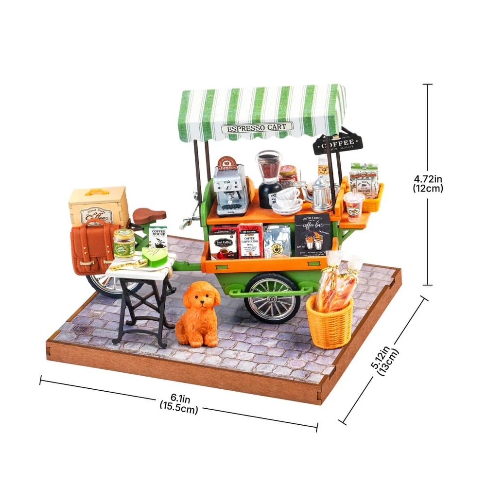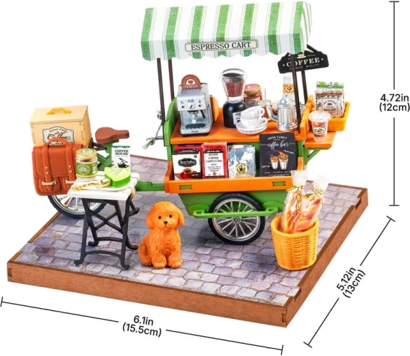 Aromat świeżej kawy i urok ulicznych kawiarni – to wszystko w eleganckiej miniaturze. Wózek kawowy inspirowany europejską sceną kawiarnianą zachwyci miłośników miniatur i kawy. Dzięki starannie opracowanym detalom (ekspres, filiżanki, syropy, bagietki, stolik, piesek) model wygląda realistycznie i urozmaici każdą witrynę czy kącik do pracy.