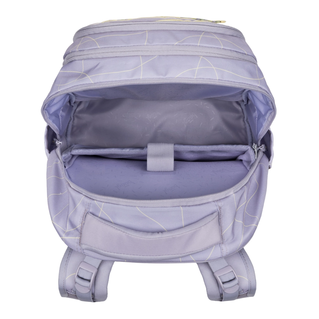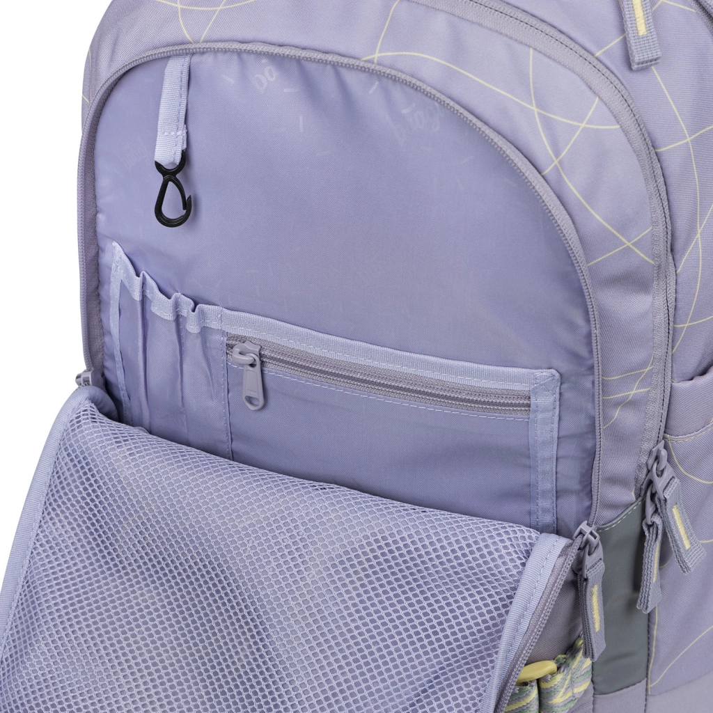 Trójkomorowy układ z przejrzystym organizerem, aksamitną kieszenią na laptop lub tablet oraz praktycznymi, dwukierunkowymi zamkami YKK zapewnia szybki dostęp i bezpieczne przechowywanie przyborów szkolnych oraz elektroniki. Boczne kieszenie z wytrzymałego materiału mieszczą butelkę z napojem i są spójne z designem plecaka. Trwały, wodoodporny materiał z certyfikatem GRS oraz wyraźne elementy odblaskowe zwiększają bezpieczeństwo i dbałość o środowisko.
