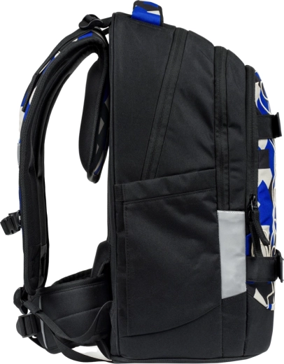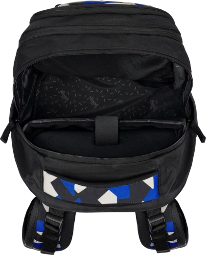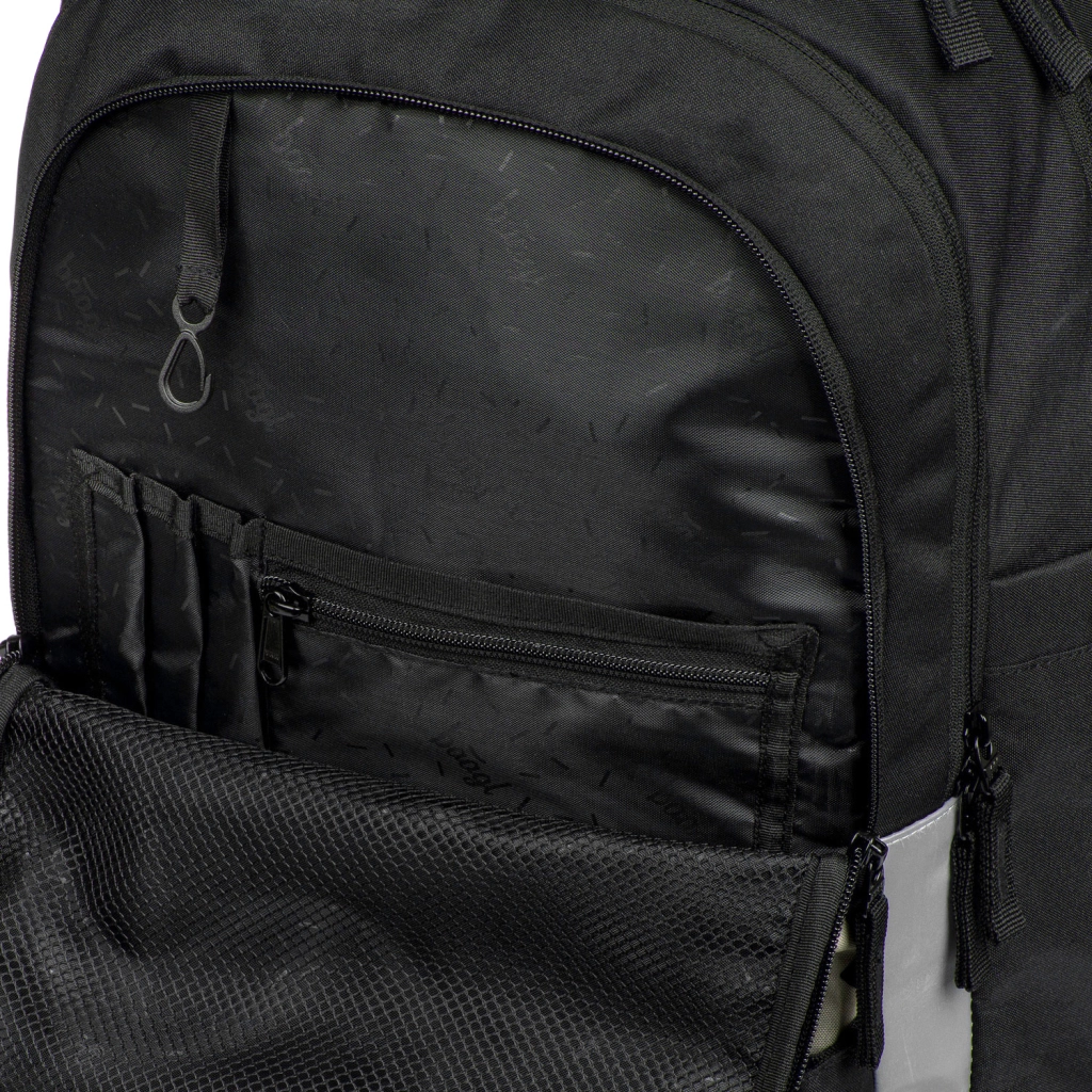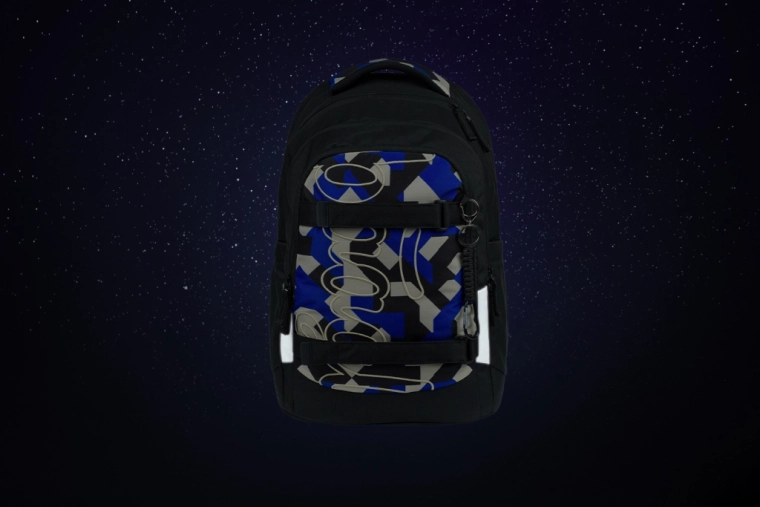 Trzykomorowy układ plecaka obejmuje aksamitną kieszeń na laptop, praktyczne dwukierunkowe zamki YKK oraz boczne kieszenie na butelkę. Wewnętrzny organizer utrzymuje porządek w przyborach szkolnych, natomiast piórnik z podwójną odchylaną klapką i wewnętrzną kieszenią pomieści artykuły piśmiennicze (dostarczany bez wyposażenia). Worek z mocnymi sznurkami sprawdzi się na obuwie lub sprzęt sportowy i można go nosić na plecach.