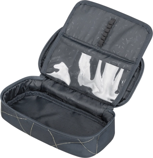 Pojemny piórnik z podwójną odchylaną klapą, wewnętrzną kieszonką i okienkiem na plan lekcji + wytrzymały, zmywalny worek ze sznurkami ściągającymi.