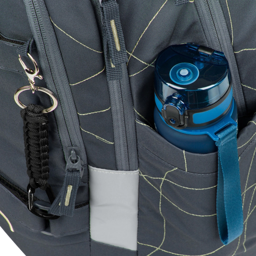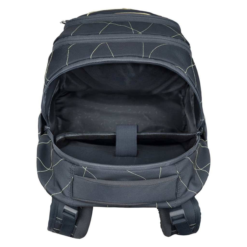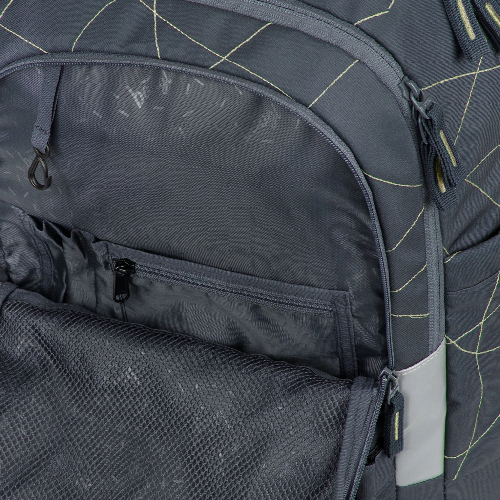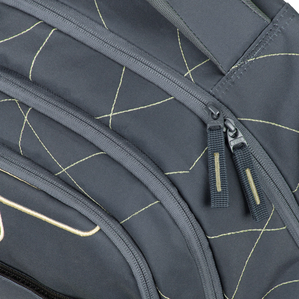 Trzykomorowy układ, aksamitna kieszeń na laptop lub tablet oraz dwukierunkowe zamki YKK zapewniające szybki dostęp i bezpieczne przechowywanie przyborów szkolnych.