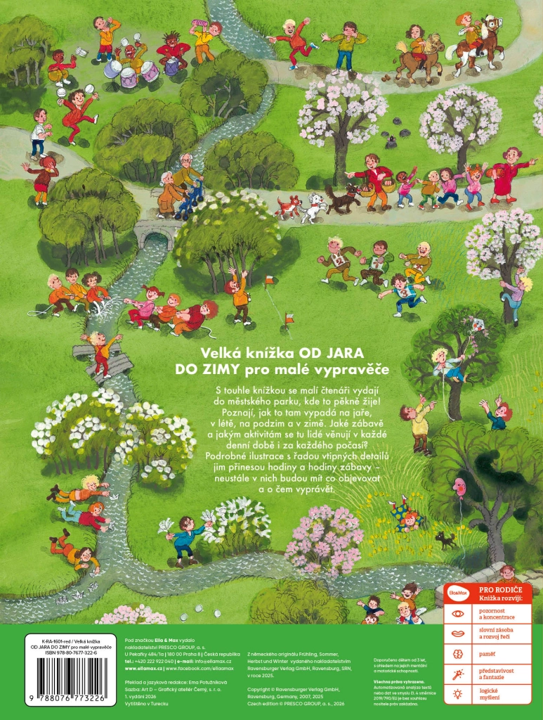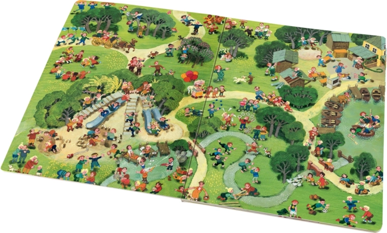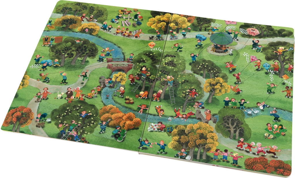 Ta wielkoformatowa książka obrazkowa prowadzi dzieci przez tętniący życiem miejski park na przestrzeni czterech pór roku – wiosny, lata, jesieni i zimy. Każda strona jest pełna drobnych opowieści, aktywności i postaci, które zmieniają się w zależności od pory dnia i pogody. Dzięki bogatym ilustracjom dzieci nieustannie odkrywają nowe powiązania i rozwijają spostrzegawczość.