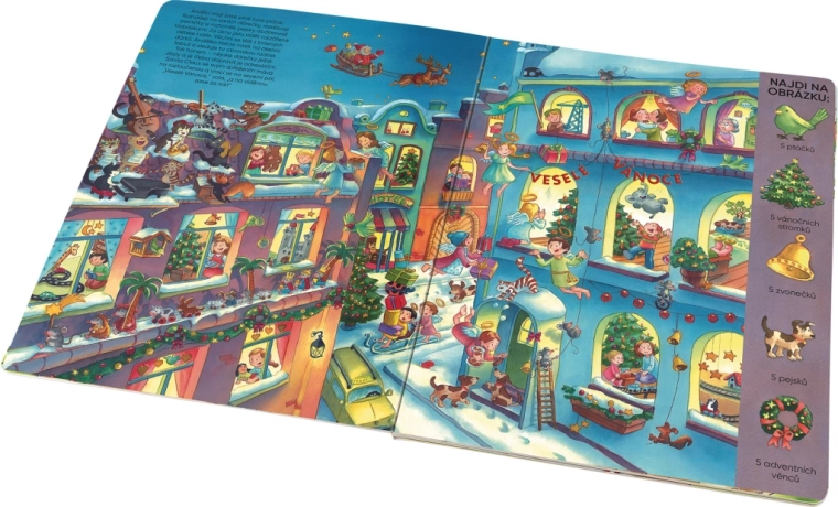 Ta duża książka obrazkowa przenosi dzieci w świąteczną atmosferę prosto do domu. Dzieci mogą wspólnie z rodzicami odkrywać bogato ilustrowane sceny, opowiadać własne historie i jednocześnie rozwijać słownictwo, koncentrację oraz percepcję wzrokową. Każda rozkładówka oferuje wyzwania polegające na wyszukiwaniu przedmiotów według poleceń, co czyni z książki świetną aktywność na wspólne zimowe wieczory.