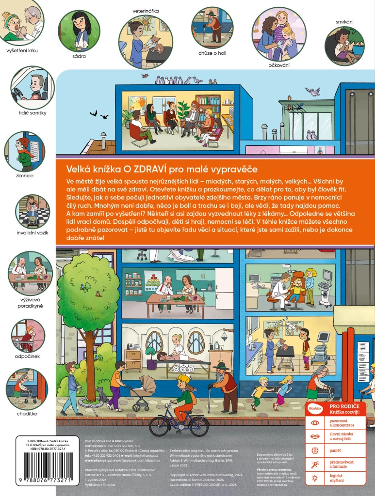 Książka jest bogata w szczegółowe ilustracje, które wspierają opowiadanie historii, rozwój słownictwa i naturalną ciekawość. Wspólne oglądanie otwiera przestrzeń do rozmów o profilaktyce, bezpieczeństwie, emocjach oraz o tym, jak radzić sobie z powszechnymi chorobami.