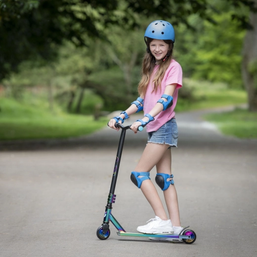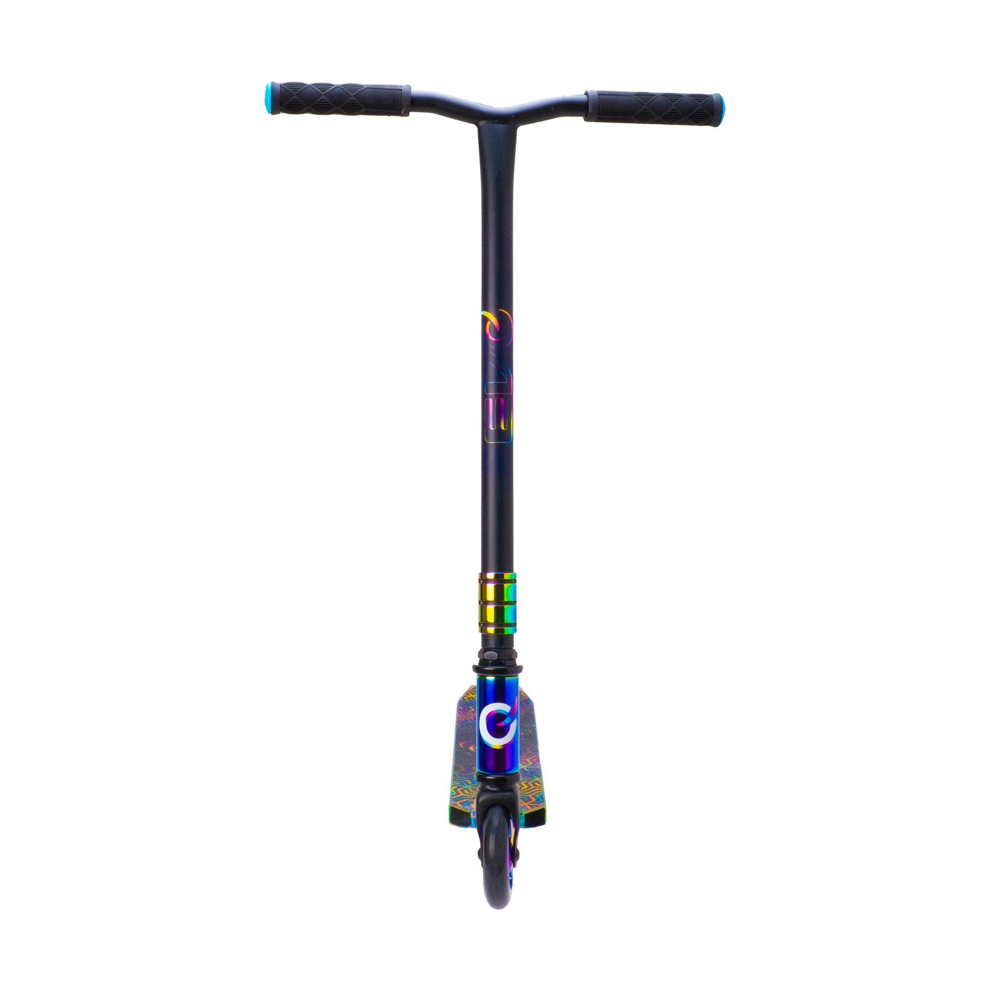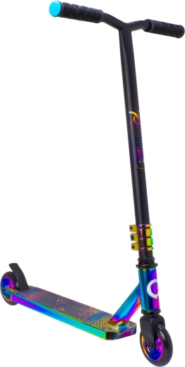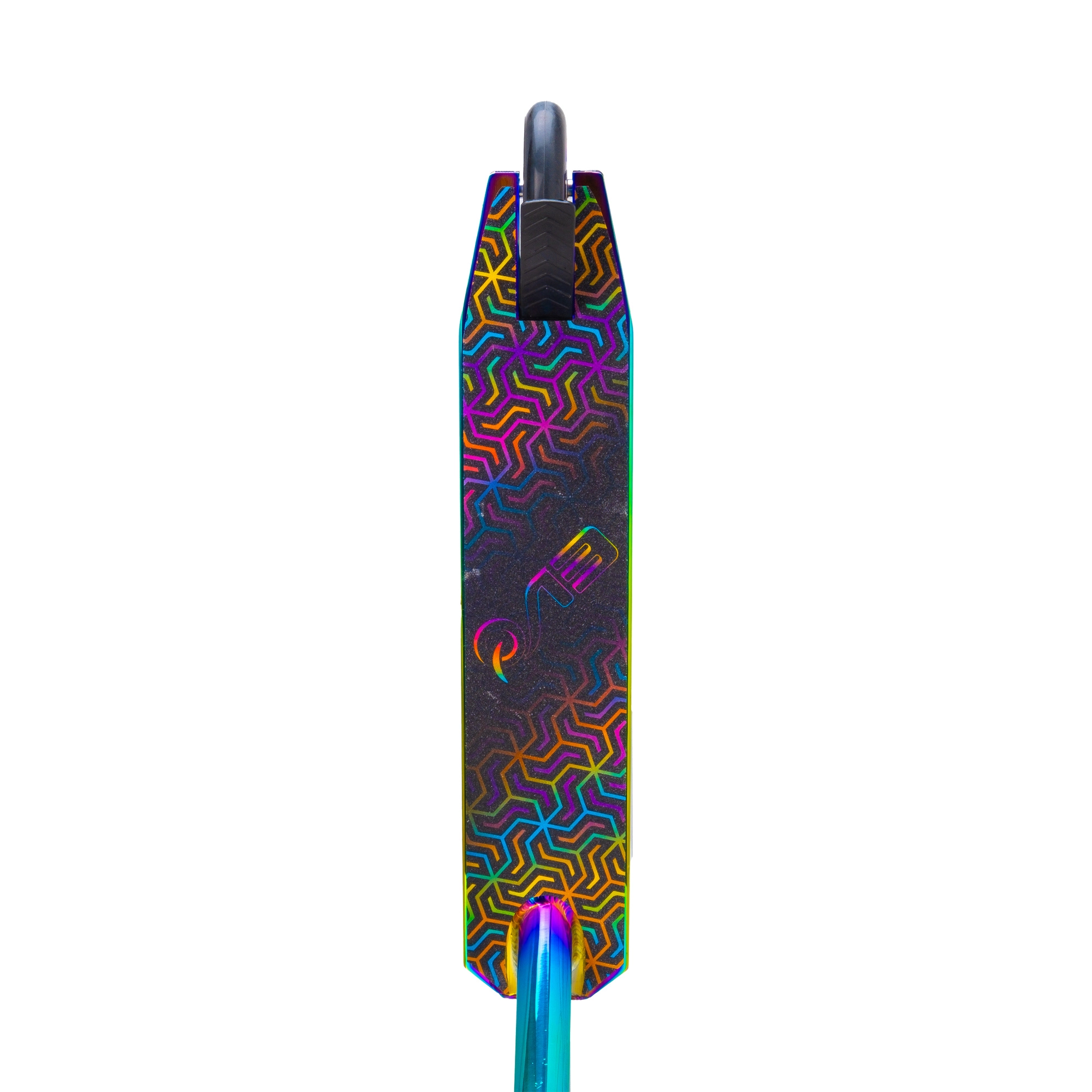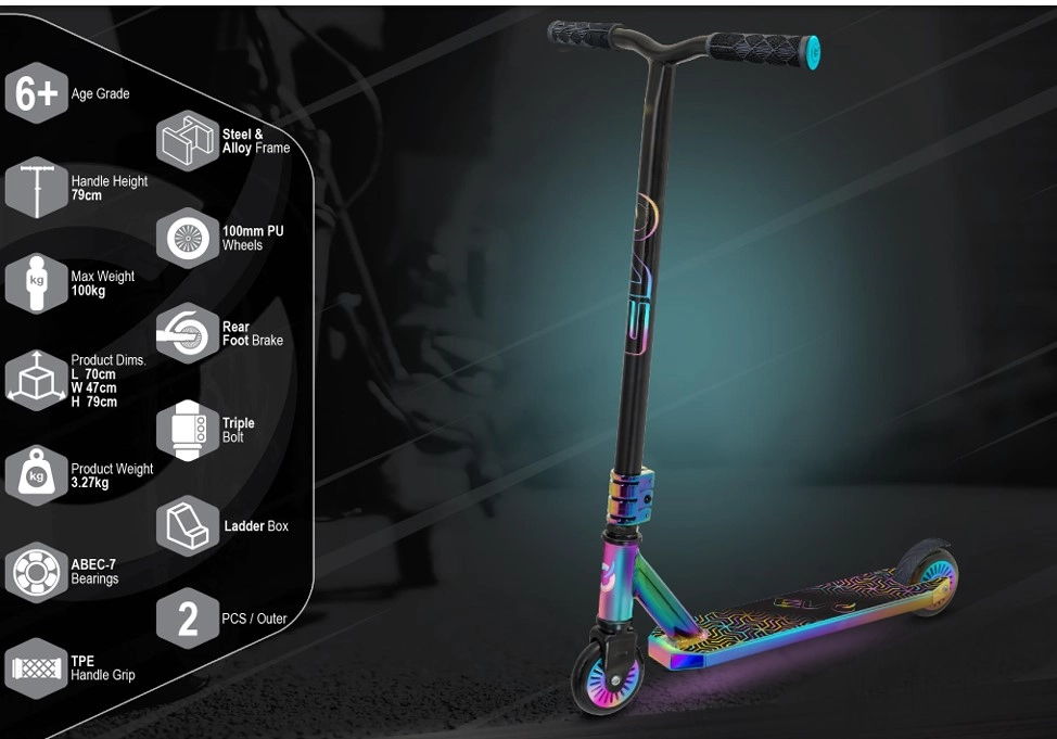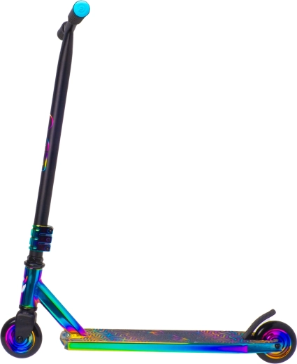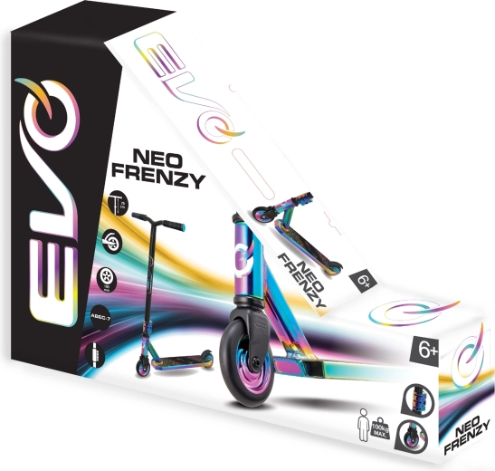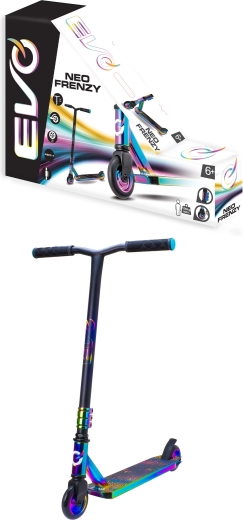 Stylowa hulajnoga freestylowa EVO Neo Frenzy dla dzieci od 6 lat oferuje solidną konstrukcję do trików, płynną jazdę dzięki łożyskom ABEC-7 oraz atrakcyjny tęczowy wygląd neo-chrome. Do tego kierownica typu T-bar z wygodnymi chwytami, tylny hamulec nożny i metalowe rdzenie kółek zapewniają stabilność i pewność zarówno w parku, jak i w mieście.