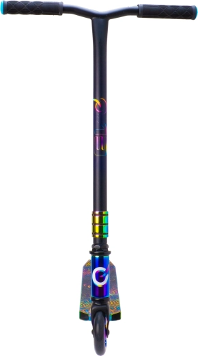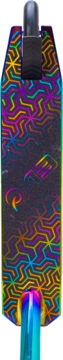 Iryzujące (tęczowe) wykończenie decku, widelca i obejmy nadaje hulajnodze niepowtarzalny wygląd i zachęca do jazdy.