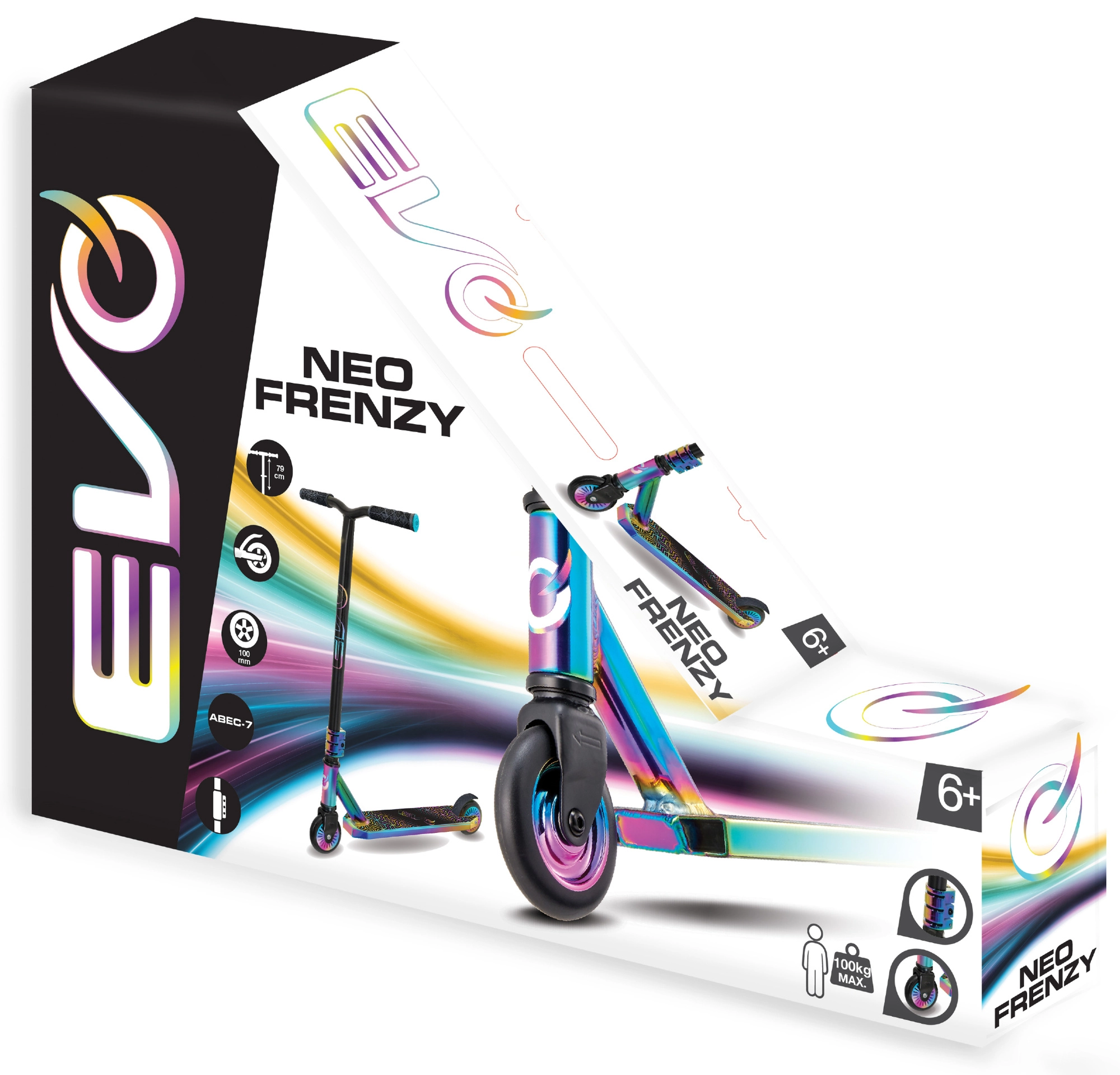 EVO Neo Frenzy to dziecięca hulajnoga stunt zaprojektowana do nauki równowagi i pierwszych trików. Solidny metalowy deck z antypoślizgową taśmą grip oraz wytrzymały widelec zapewniają stabilność, a małe twarde kółka z łożyskami ABEC-7 oferują szybkie przyspieszenie i płynną jazdę. Wyraziste detale neo-chrome przyciągają wzrok i nadają hulajnodze unikalny styl.