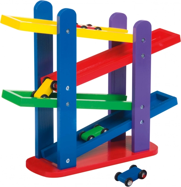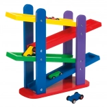 Drewniany tor samochodowy z trzema kolorowymi autkami zapewnia nieskończoną zabawę dzięki łatwemu przewracaniu na kaskadowych, kolorowych dróżkach.
