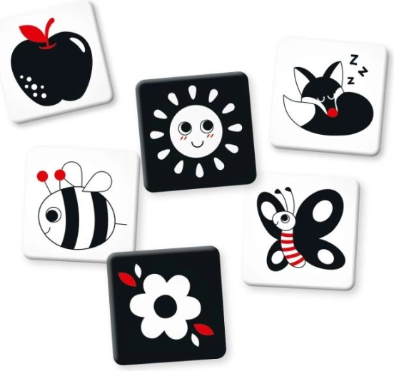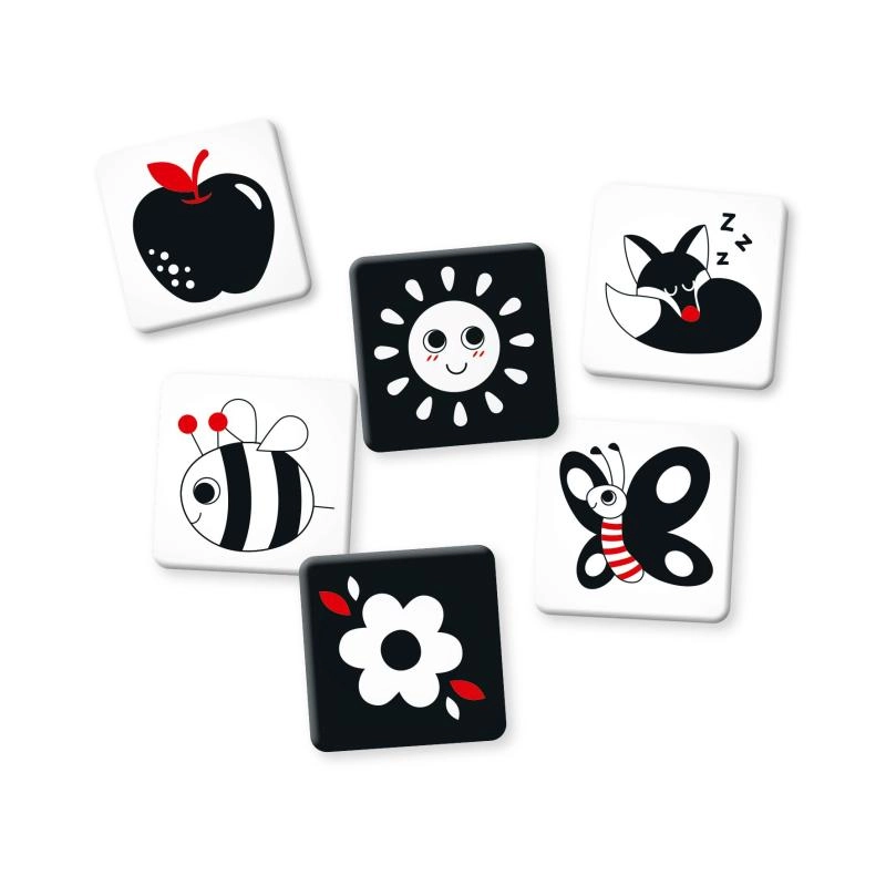 Ta prosta gra edukacyjna jest idealna na spokojne chwile na macie, do łóżeczka, wózka lub podczas tummy time. Dzięki kontrastom dziecko otrzymuje silne bodźce dla wczesnego rozwoju poznawczego i uczy się koncentrować na kształcie, wzorze i konturze.