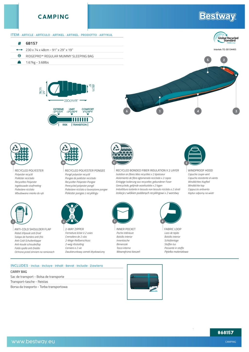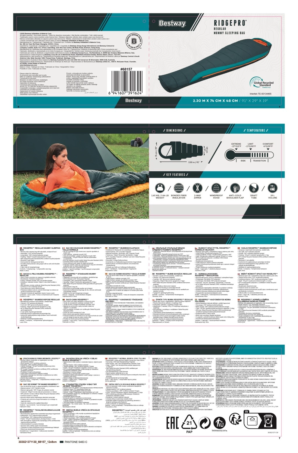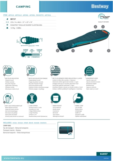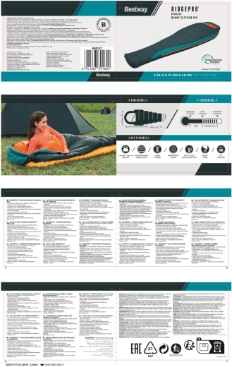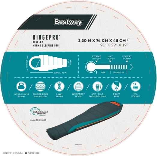 BESTWAY RidgePro to śpiwór typu mumia zaprojektowany dla niezawodnej izolacji termicznej i wygody od wiosny do jesieni. Kształt otulający ciało minimalizuje ucieczkę ciepła, a recyklingowane materiały (na zewnątrz poliester 210T ripstop, wewnątrz 190T pongee) zapewniają trwałość, przyjemny dotyk i mniejszy ślad środowiskowy.