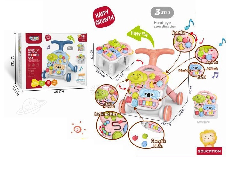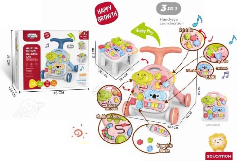 Wielofunkcyjny chodzik i edukacyjny stolik 3 w 1 wspiera naturalny rozwój dziecka od 12 miesięcy. Oferuje chodzik, stolik oraz odpinany interaktywny panel z pianinkiem i elementami rozwijającymi motorykę, zmysły oraz rozpoznawanie kształtów, kolorów i dźwięków. Dzięki stabilnej konstrukcji, możliwości dociążenia nóżek wodą lub piaskiem oraz antypoślizgowym kółkom z blokadą zabawa jest bezpieczna i płynna.