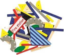 Kolorowe drewniane kształty i obrazki na korkowej podstawce pobudzają wyobraźnię i pozwalają układać wozy strażackie, remizy oraz całe scenki.