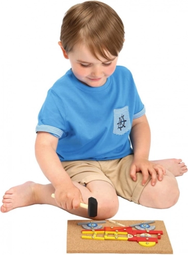 Zestaw zawiera korkową podkładkę, młotek, gwoździki i różnorodne drewniane kształty – wszystko do bezpiecznego i wielokrotnego układania.