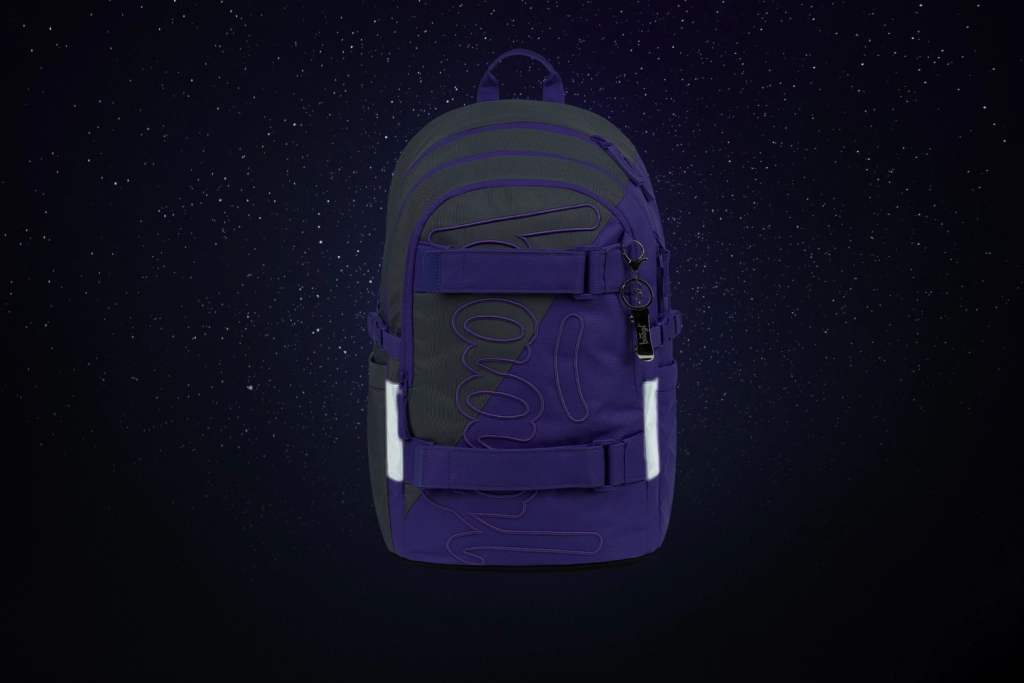 Wodoodporny materiał z certyfikatem GRS, wysokiej jakości zamki YKK oraz elementy odblaskowe dla lepszej widoczności. Przednie paski łatwo mocują deskorolkę.