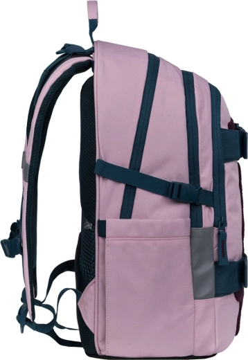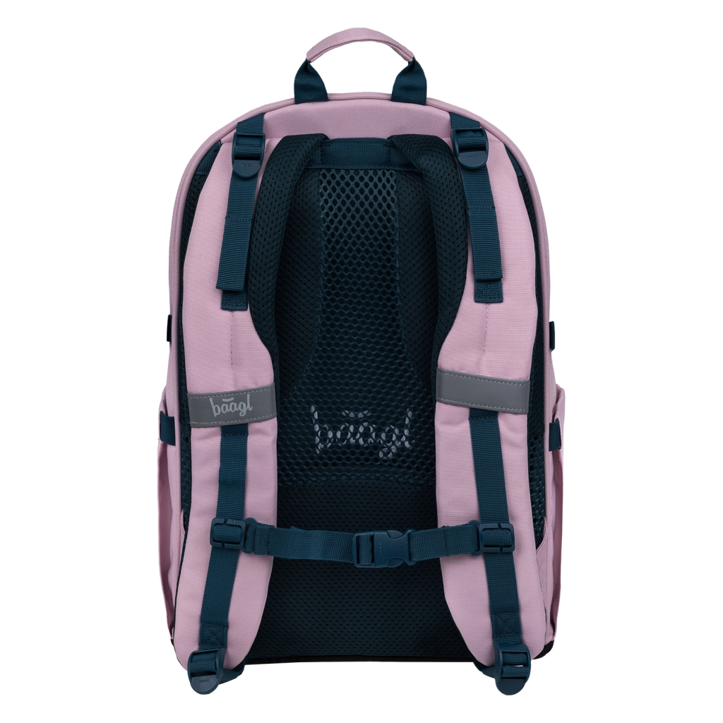 Stylowy i funkcjonalny szkolny zestaw BAAGL Skate Rose dla starszych uczniów i studentów łączy lekko anatomiczny plecak z paskami na deskorolkę, pojemny piórnik, składaną torbę sportową, praktyczną nerkę oraz etui na laptopa. Wszystko z materiałów z recyklingu, wodoodpornych, z certyfikatem GRS, z wysokiej jakości zamkami YKK i elementami odblaskowymi dla codziennego bezpieczeństwa.