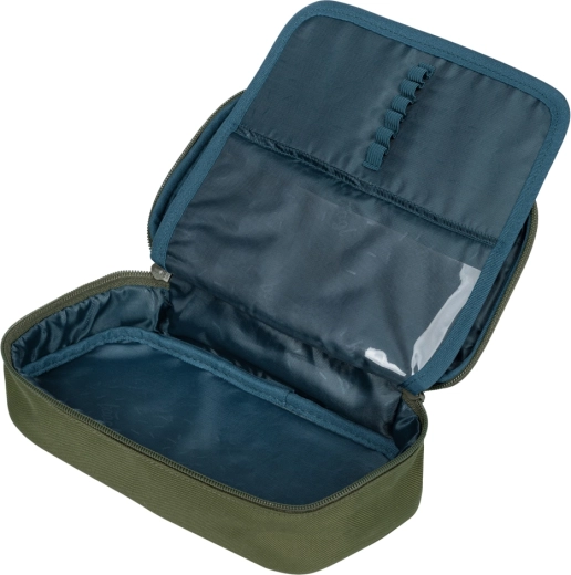 Zestaw uzupełnia pojemny piórnik z podwójną klapką i kieszenią, składana torba sportowa HOOP (ok. 22 l, 170 g) z regulowanym paskiem, nerka na drobiazgi oraz wielofunkcyjny organizer/pokrowiec. Wszystko w spójnym wzornictwie Olive z materiałów z recyklingu, odpornych na zużycie.