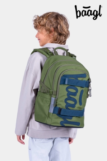 Praktyczny zestaw szkolny BAAGL Skate Olive łączy lekkie i wytrzymałe wyposażenie dla uczniów od 3. klasy szkoły podstawowej aż po studentów. Zestaw obejmuje ergonomiczny plecak z mocowaniem na deskorolkę, pojemny piórnik, składaną torbę sportową, nerkę na niezbędne drobiazgi oraz pokrowiec/organizer na akcesoria lub laptop. Wszystko wykonane z materiałów z recyklingu, wodoodpornych z elementami odblaskowymi i niezawodnymi zamkami YKK, potwierdzone certyfikatem GRS.