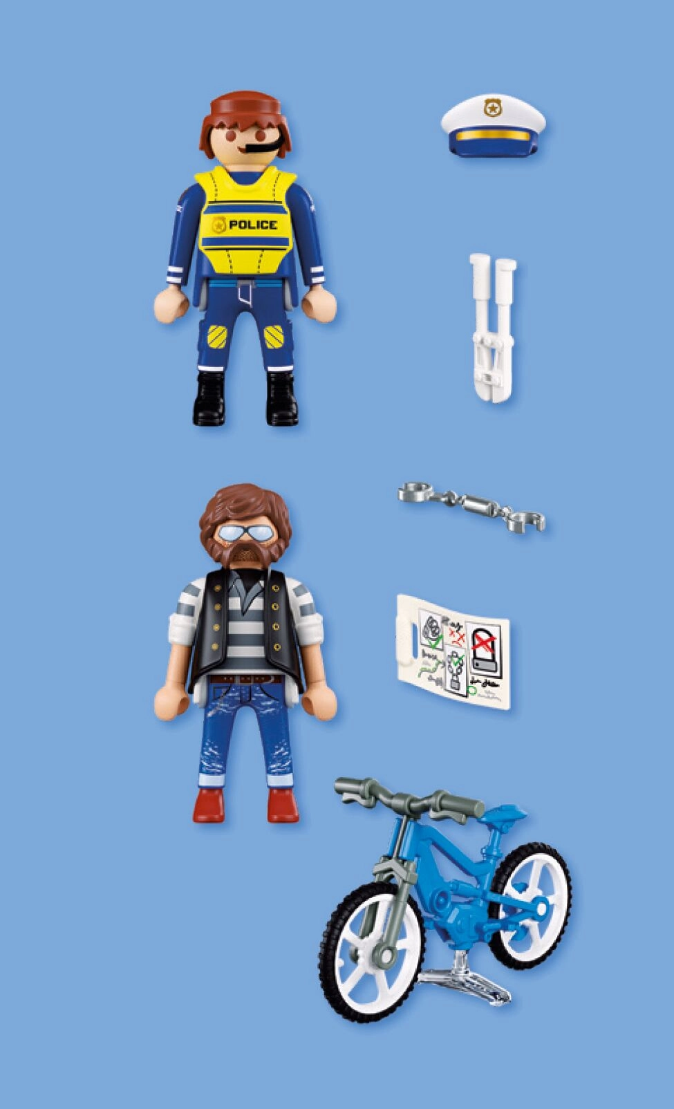 Dzięki praktycznym akcesoriom, takim jak policyjny kask, rower, kajdanki/zapięcie do roweru, szczypce/obcinaki oraz plan, dzieci ćwiczą małą motorykę i poznają podstawowe zasady bezpieczeństwa i sprawiedliwości. Kompaktowe opakowanie świetnie sprawdza się także w podróży.