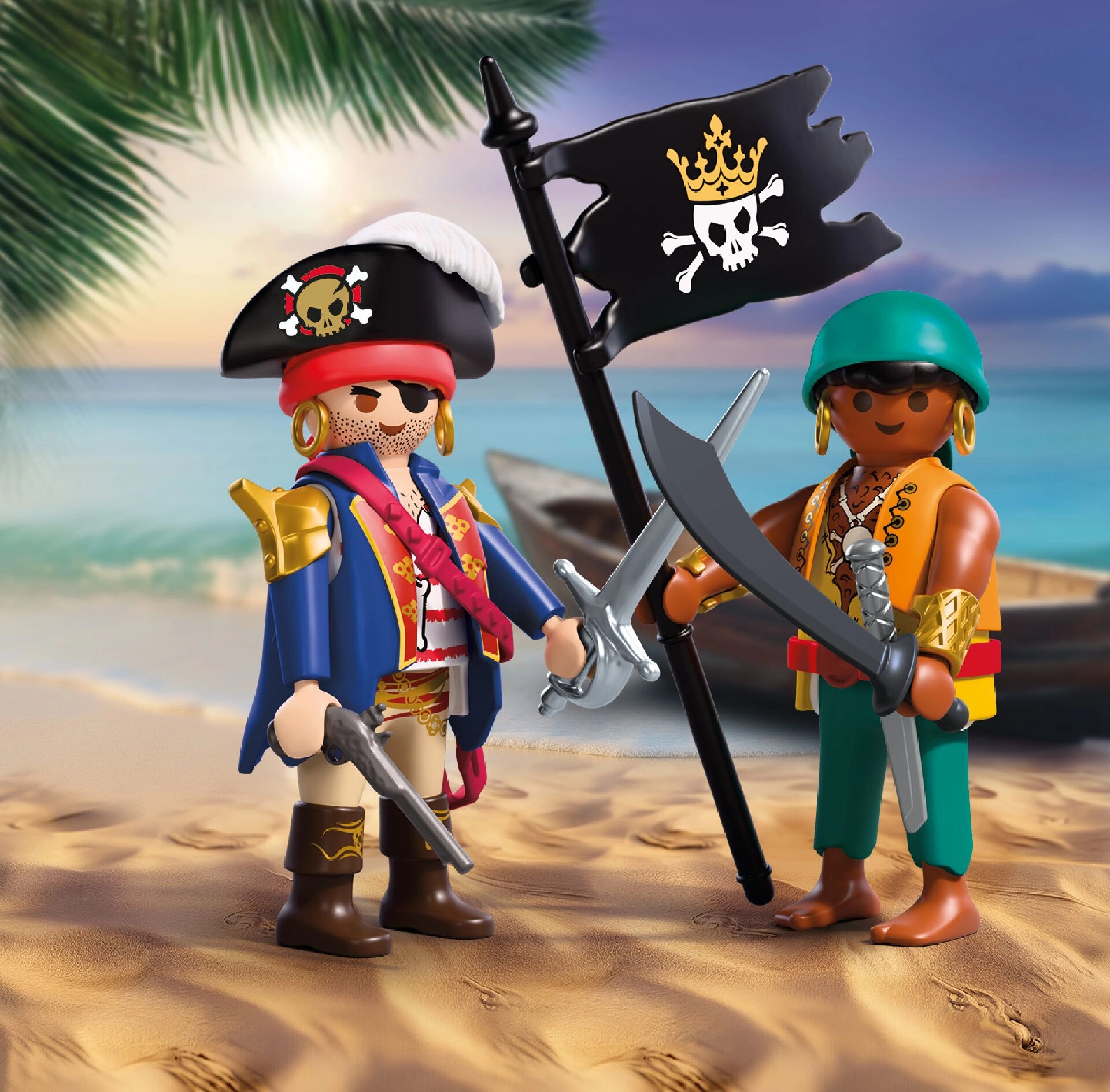 Ten kompaktowy zestaw z serii Duo Pack oferuje dwie pirackie figurki (ok. 7,5 cm) gotowe na pełne akcji misje. Dzięki wyposażeniu, takim jak kapelusz, szable, pistolety czy piracka flaga, z łatwością stworzysz sceny bitew i emocjonujące poszukiwania skarbów.