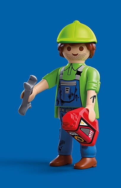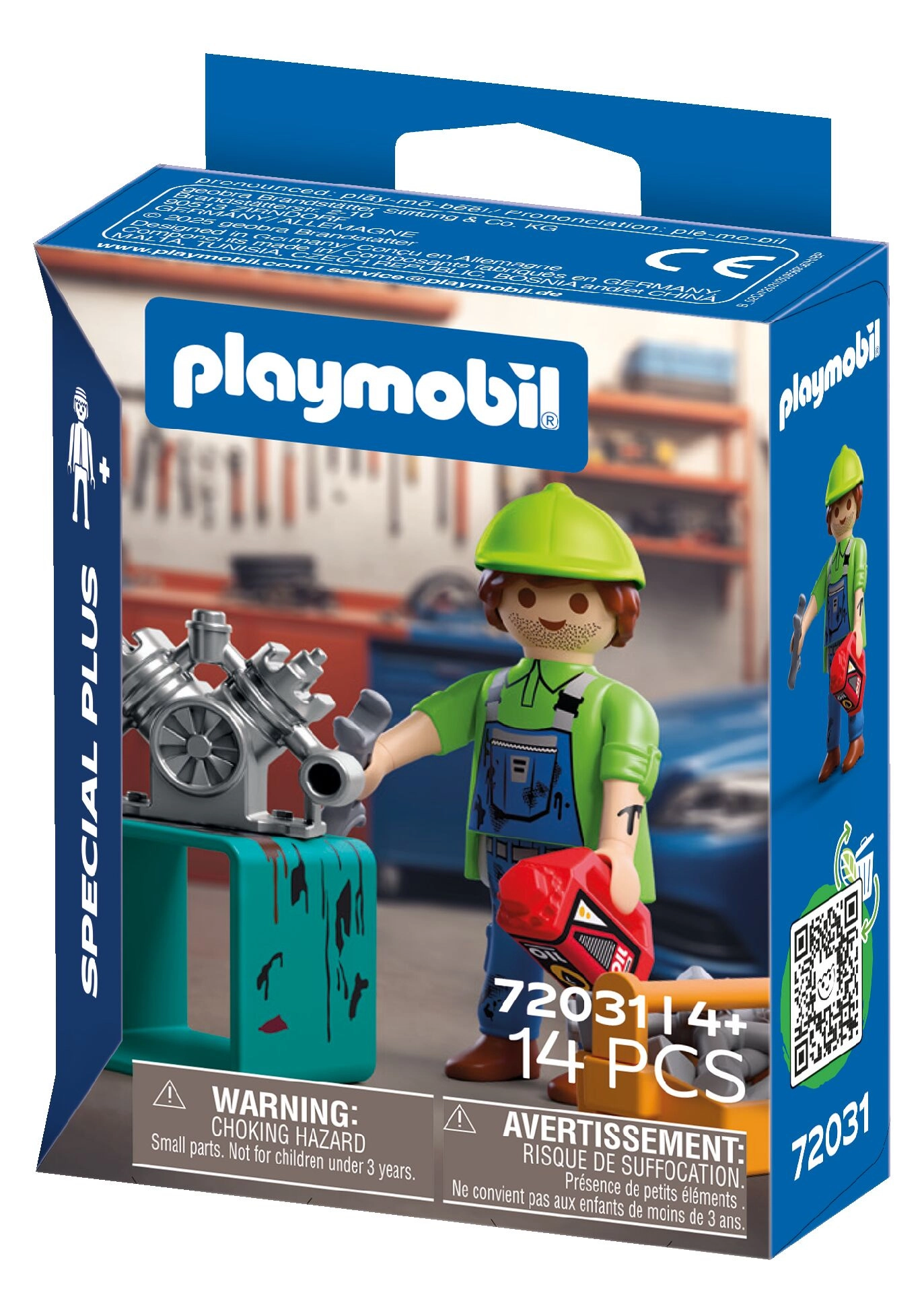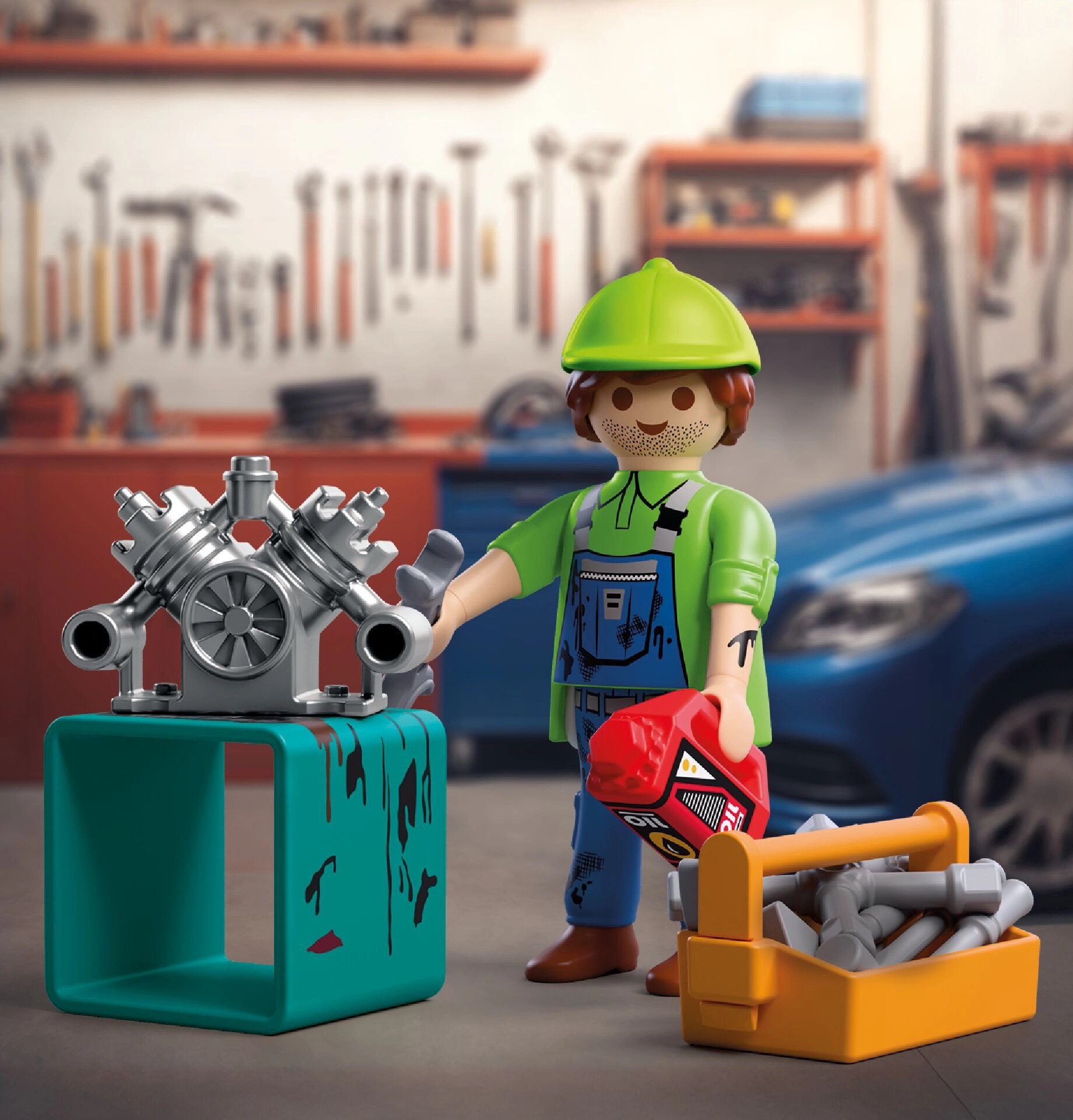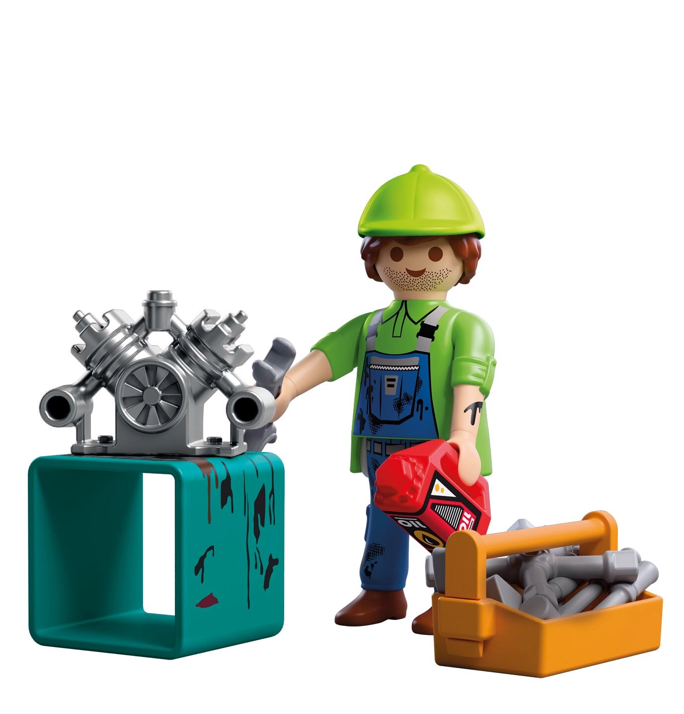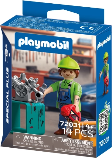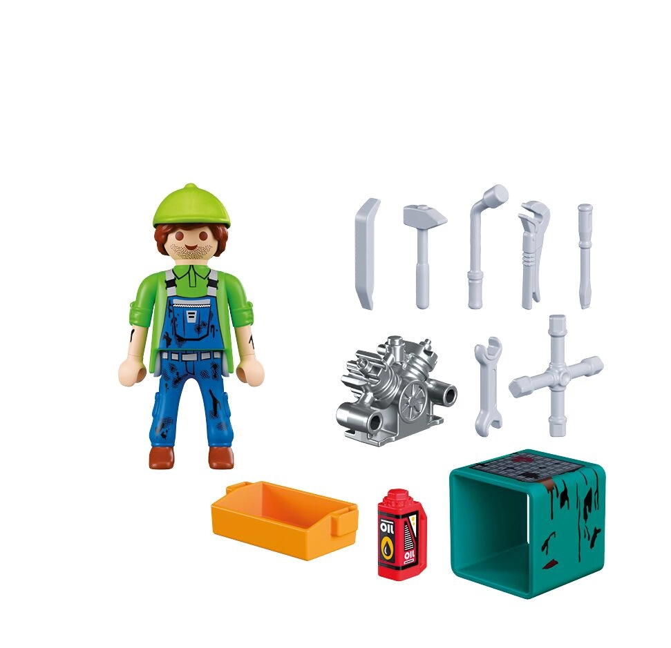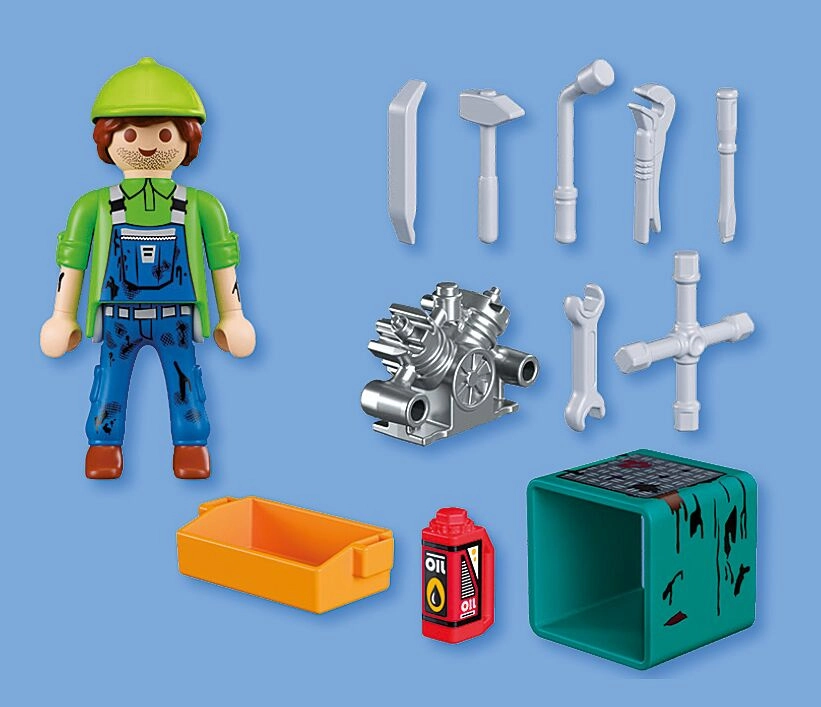W zestawie znajduje się figurka mechanika (ok. 7,5 cm), blok silnika na turkusowym stojaku, oliwiarka, pomarańczowa skrzynka na części oraz zestaw narzędzi do realistycznych napraw w zabawie w role. Zestaw można łatwo łączyć z innymi konstrukcjami PLAYMOBIL, aby stworzyć własny warsztat lub serwis.