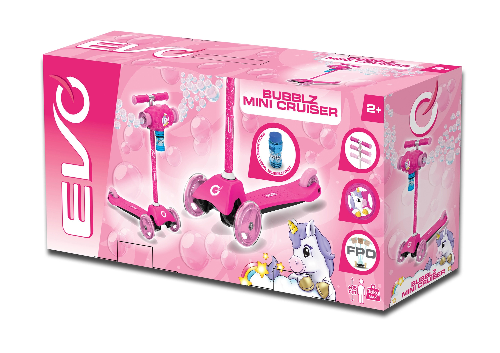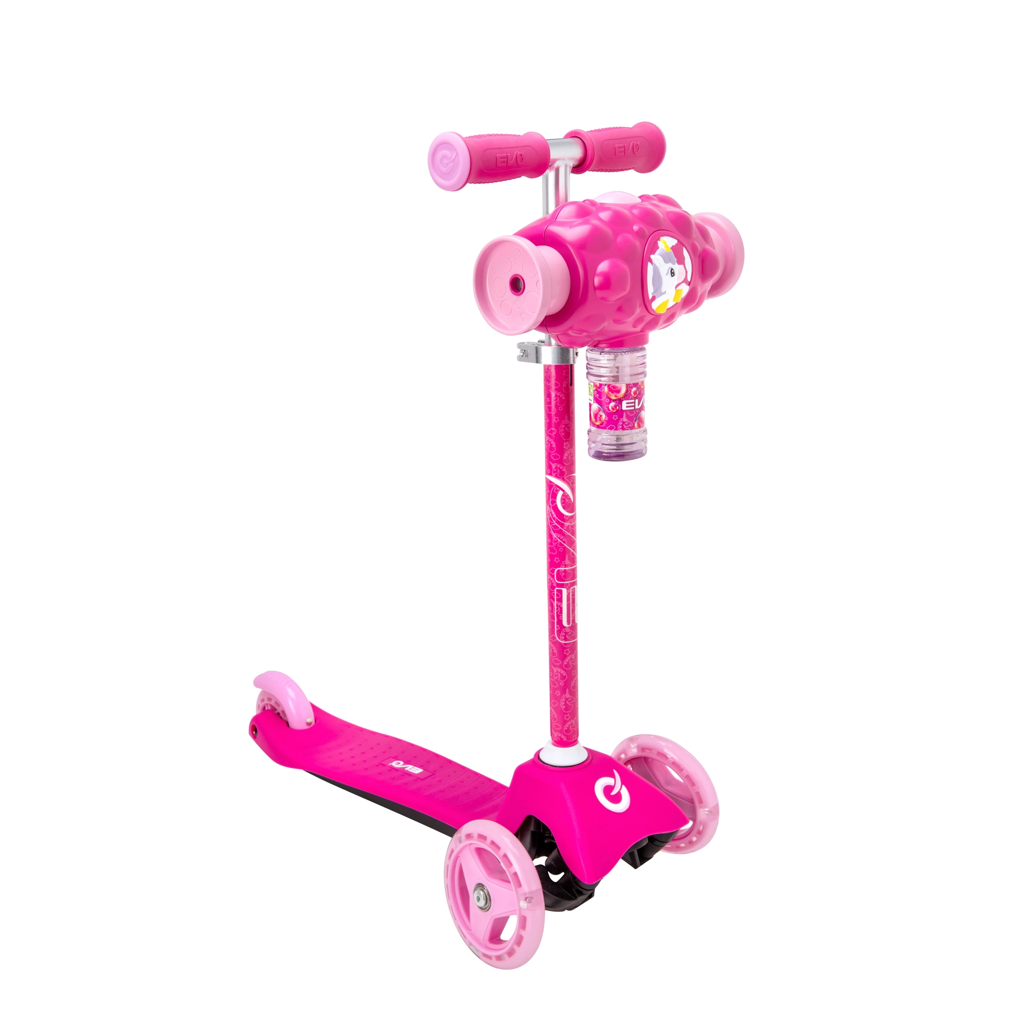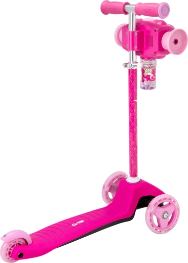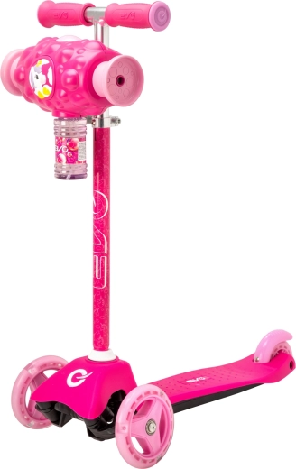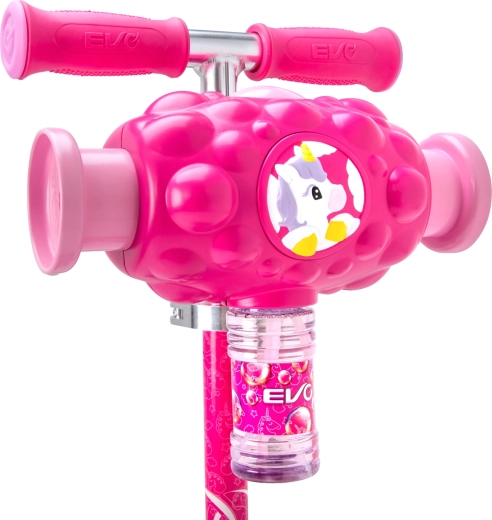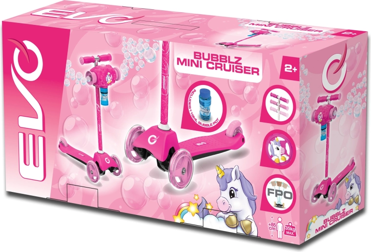 Zabawna i stabilna dziecięca hulajnoga EVO Bubblz Mini Cruiser z trzema kółkami, skrętem balansowym i regulowaną kierownicą. Wbudowana wytwornica baniek tworzy podczas jazdy mnóstwo baniek, co zachwyci dzieci. Szeroki, antypoślizgowy podest, tylny hamulec nożny i łożyska ABEC-5 zapewniają komfortową i cichą jazdę. Idealna dla dzieci od 3 lat oraz do rozwoju równowagi i koordynacji.