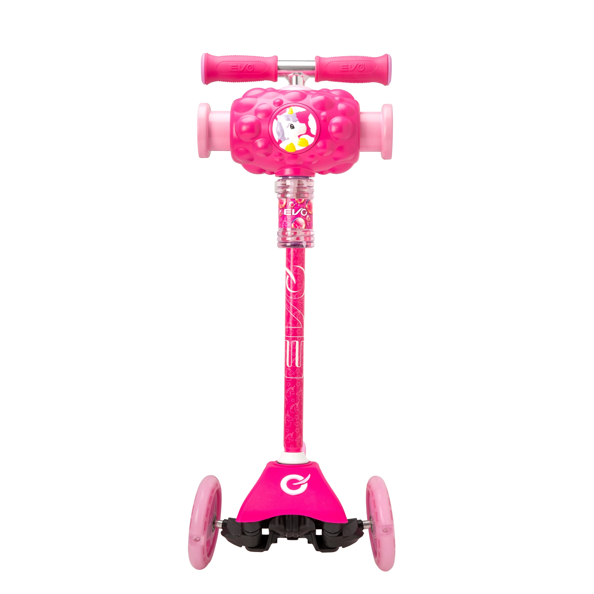 EVO Bubblz Mini Cruiser to wesoła i bezpieczna trójkołowa hulajnoga dla najmłodszych. Dzięki dwóm przednim i jednemu tylnemu kółku oferuje doskonałą stabilność, a sterowanie balansowe pomaga dzieciom naturalnie ćwiczyć równowagę i koordynację. Regulowana wysokość kierownicy pozwala dopasować hulajnogę do wzrostu dziecka, więc będzie rosnąć razem z nim.