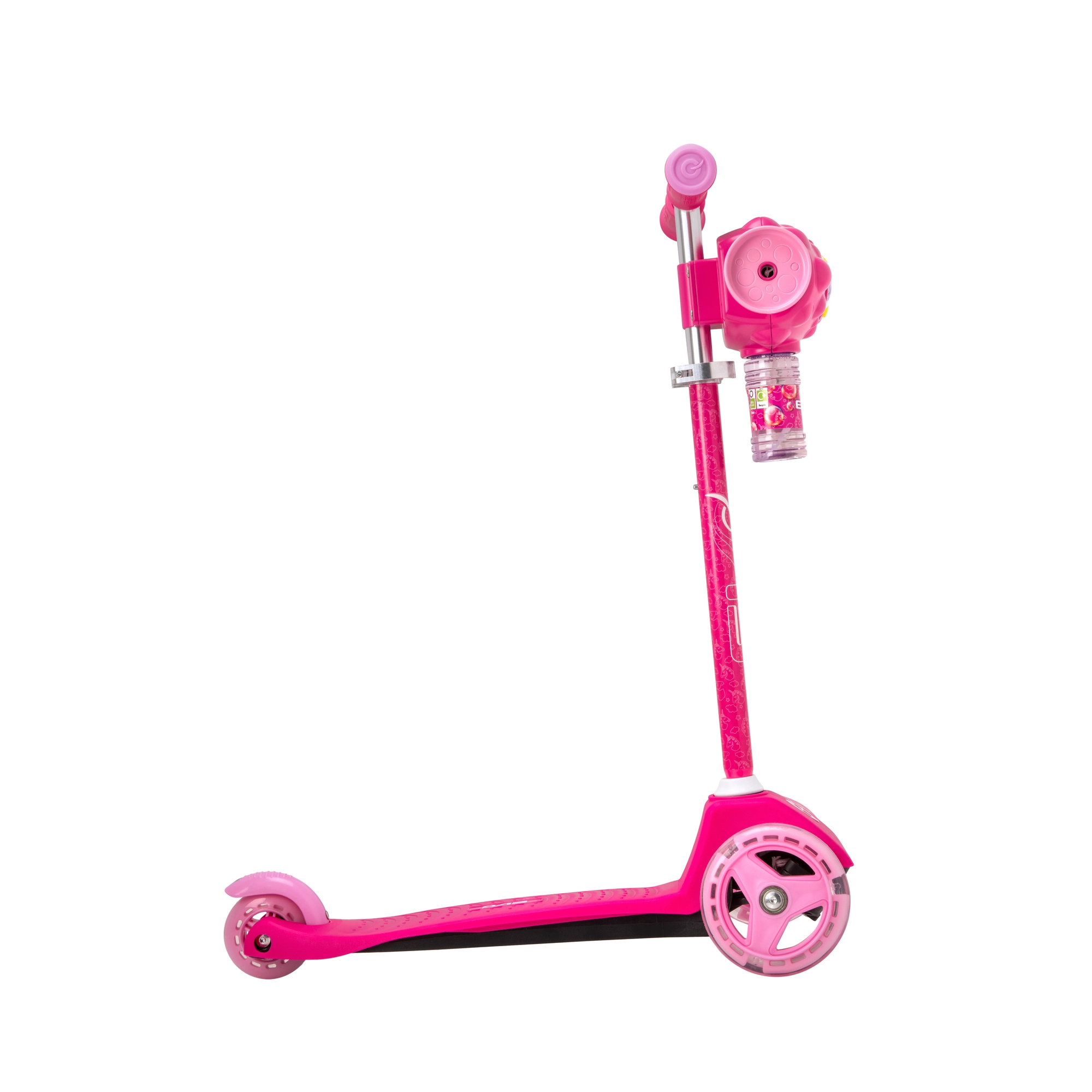 Prawdziwą atrakcją jest zintegrowana wytwornica baniek, która podczas jazdy tworzy bańki i zamienia każdą przejażdżkę w czystą radość. Antypoślizgowy podest, miękkie chwyty TPR oraz tylny hamulec nożny zwiększają pewność i wygodę sterowania.
