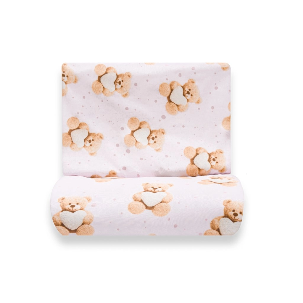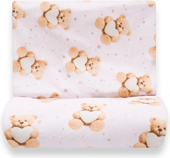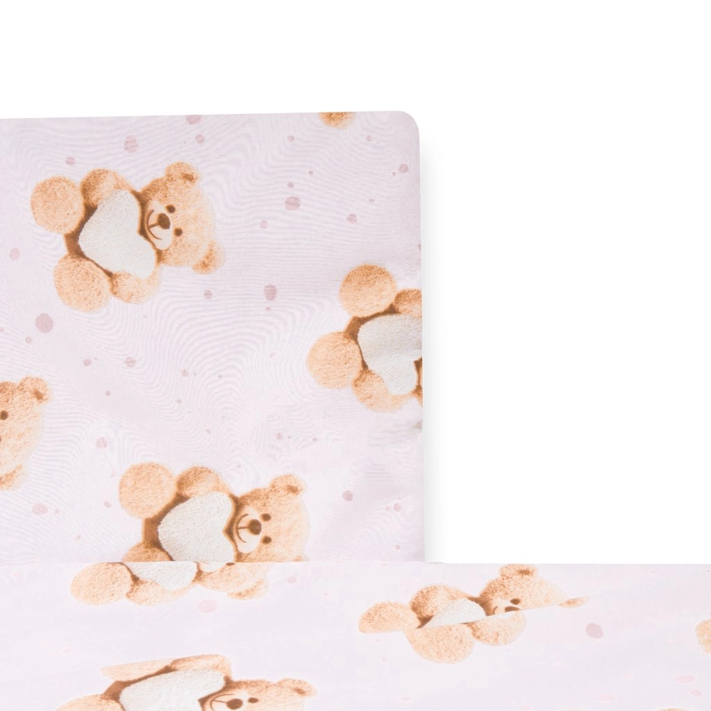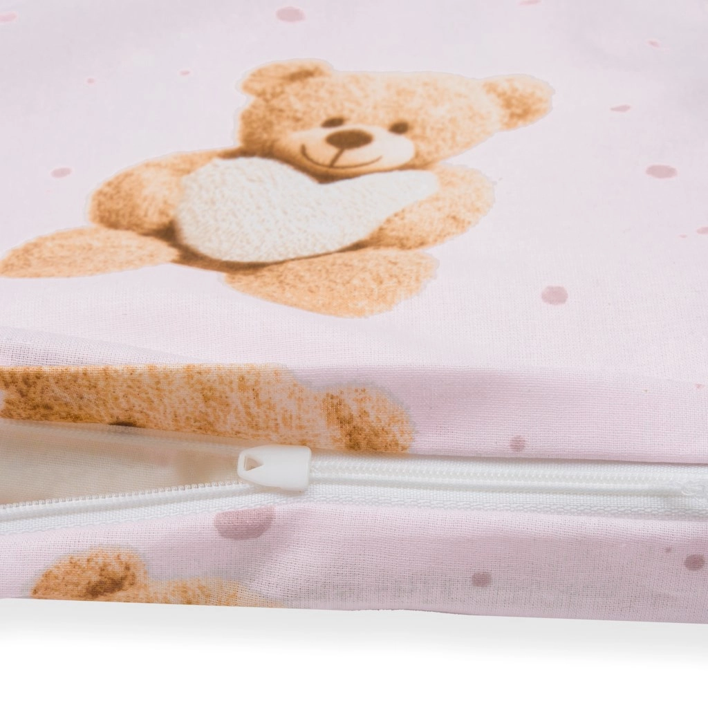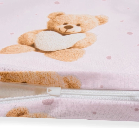 Urocza dziecięca pościel New Baby Love Teddy Bear wnosi do łóżeczka miękkość, wygodę i bezpieczeństwo. Wykonana z 100% bawełny z certyfikatem OEKO-TEX STANDARD 100, ma kojący różowy wzór z misiami oraz praktyczne bezpieczne zamki bez luźno zwisających suwaków. Zestaw zawiera poszewkę na poduszkę 40 × 60 cm i poszewkę na kołdrę 120 × 90 cm.