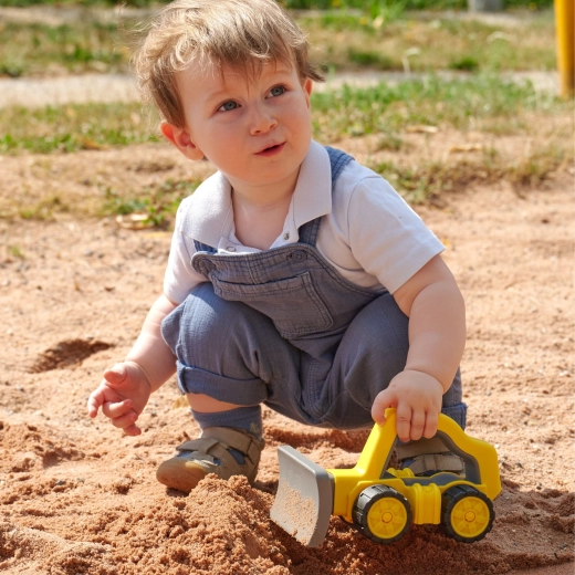 Wytrzymała konstrukcja i przednia łyżka zachęcają do spychania piasku i ziemi, rozwijając motorykę, koordynację oraz wyobraźnię.