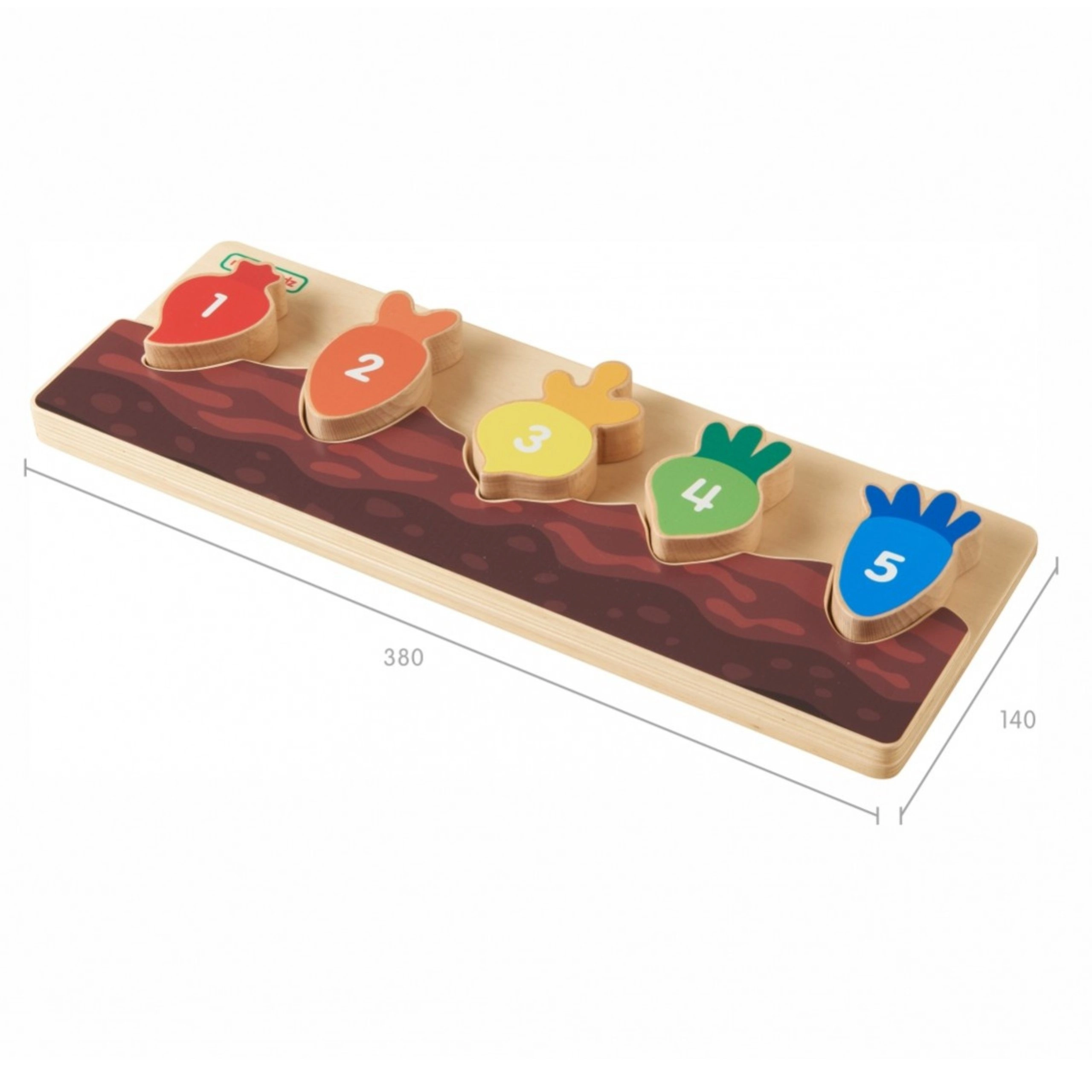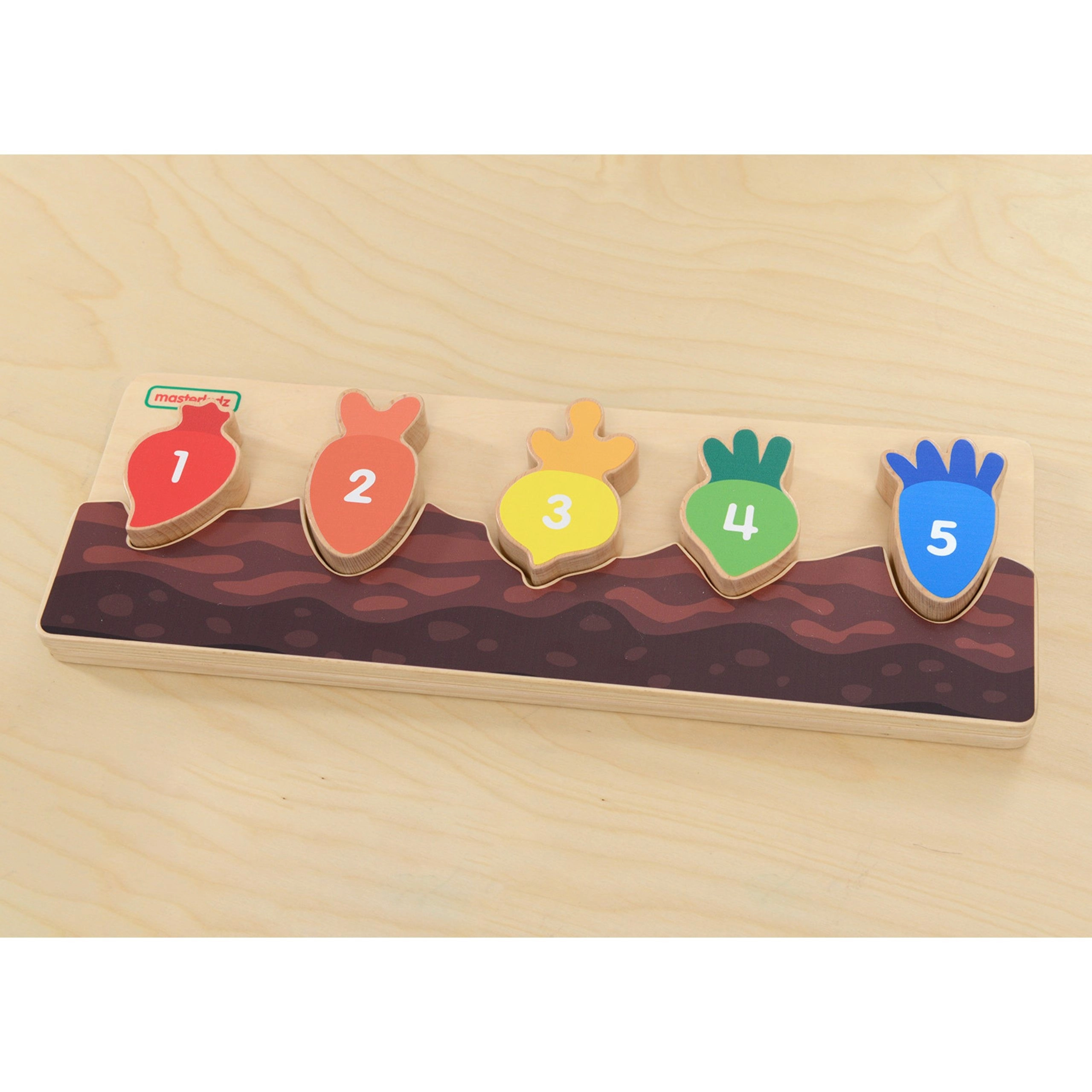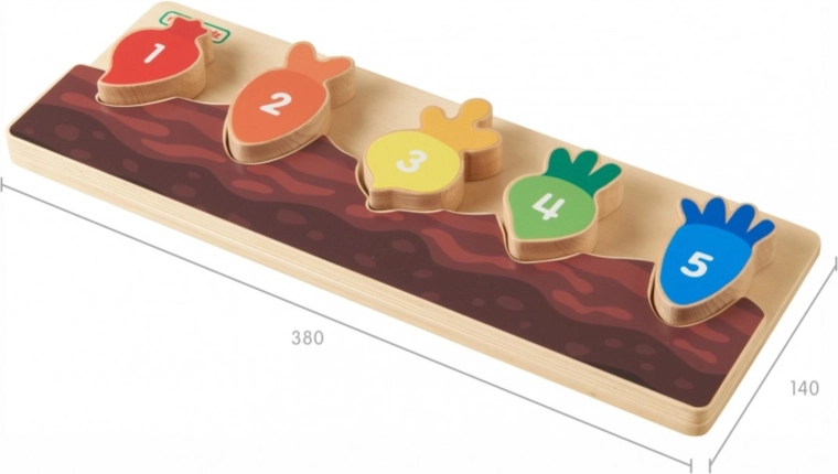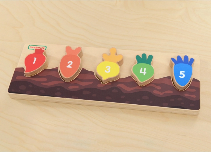Każdy kolorowy kawałek warzywa jest oznaczony liczbą i pasuje tylko do swojego wycięcia. Dzieci w naturalny sposób ćwiczą liczenie i sekwencję 1–5.
