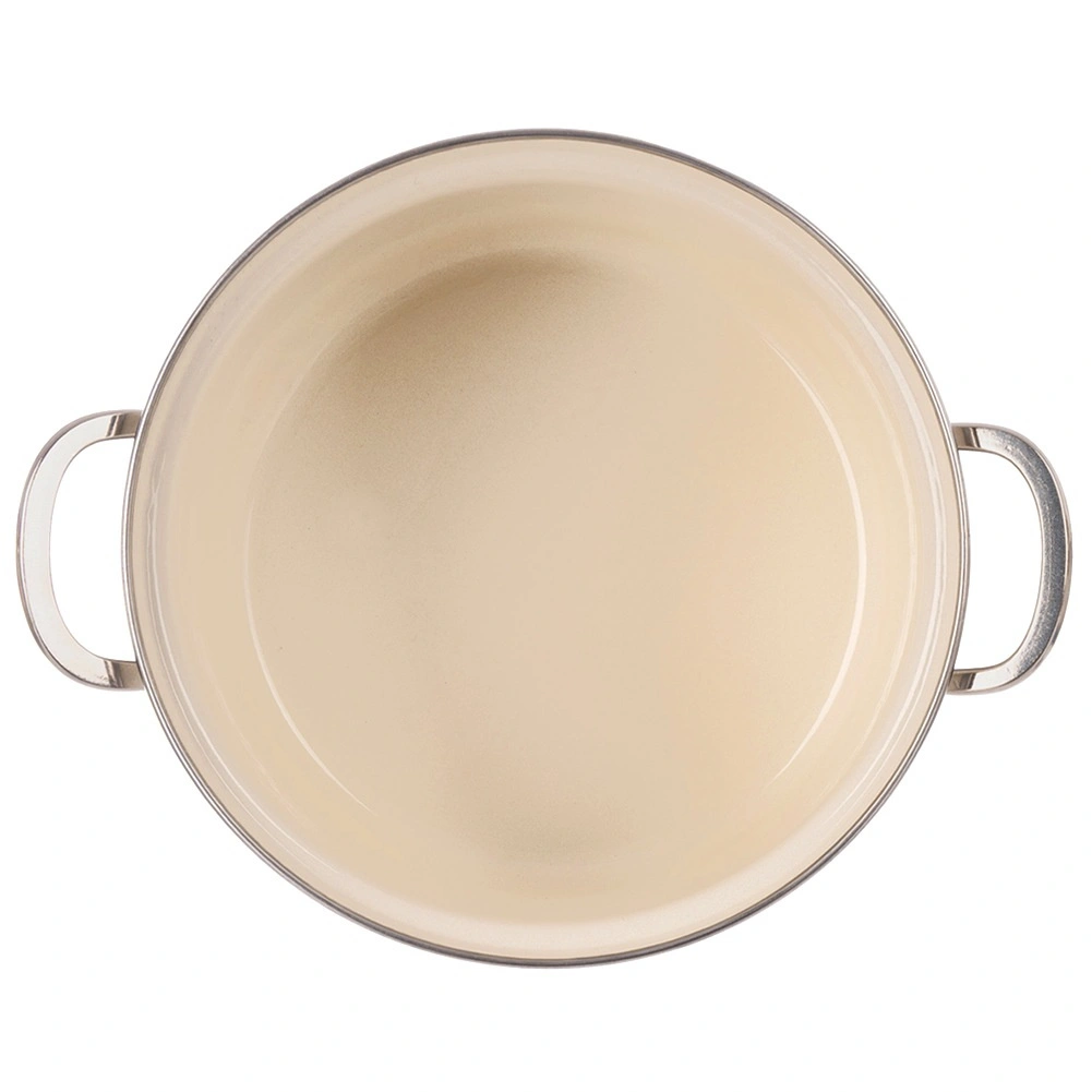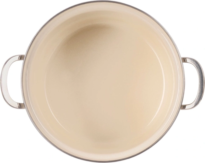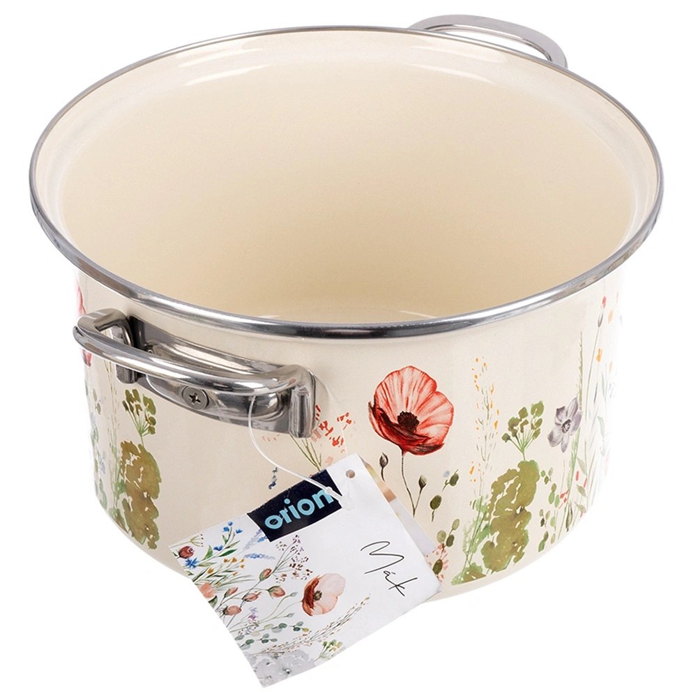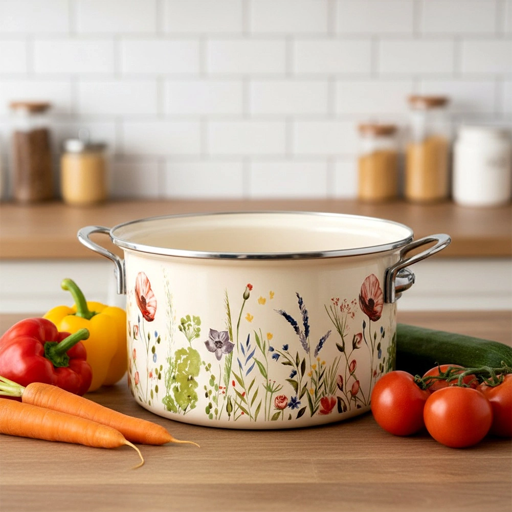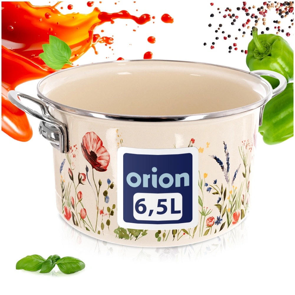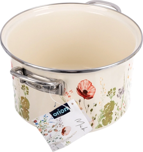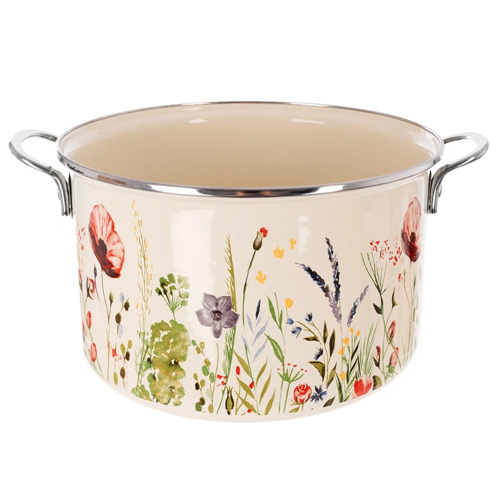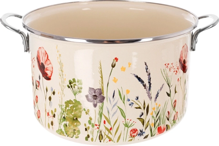 Elegancki emaliowany garnek w kremowym kolorze z motywem łąkowych kwiatów oferuje pojemność 6,5 l i średnicę 26 cm – idealny do zup, sosów i duszenia. Wykonany z wysokiej jakości emaliowanej stali ze stalowym nierdzewnym rantem i uchwytami dla bezpiecznego przenoszenia. Odpowiedni do wszystkich typów kuchenek, w tym indukcji, można używać także w piekarniku i myć w zmywarce. Materiał bezpieczny dla zdrowia jest odpowiedni również dla alergików.