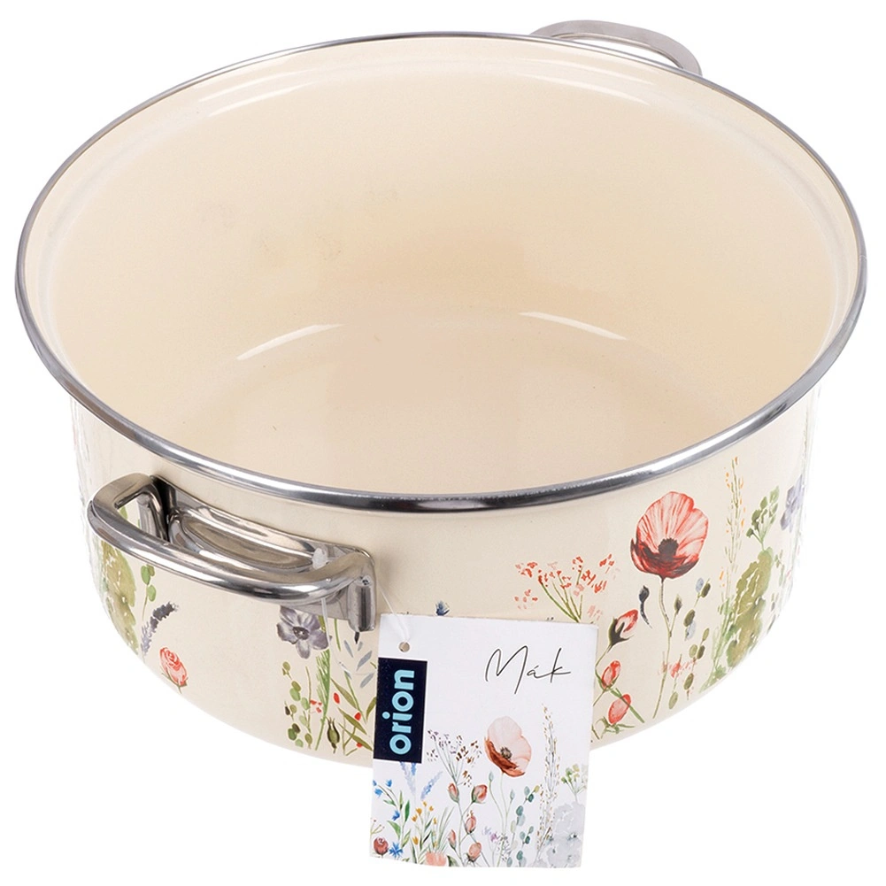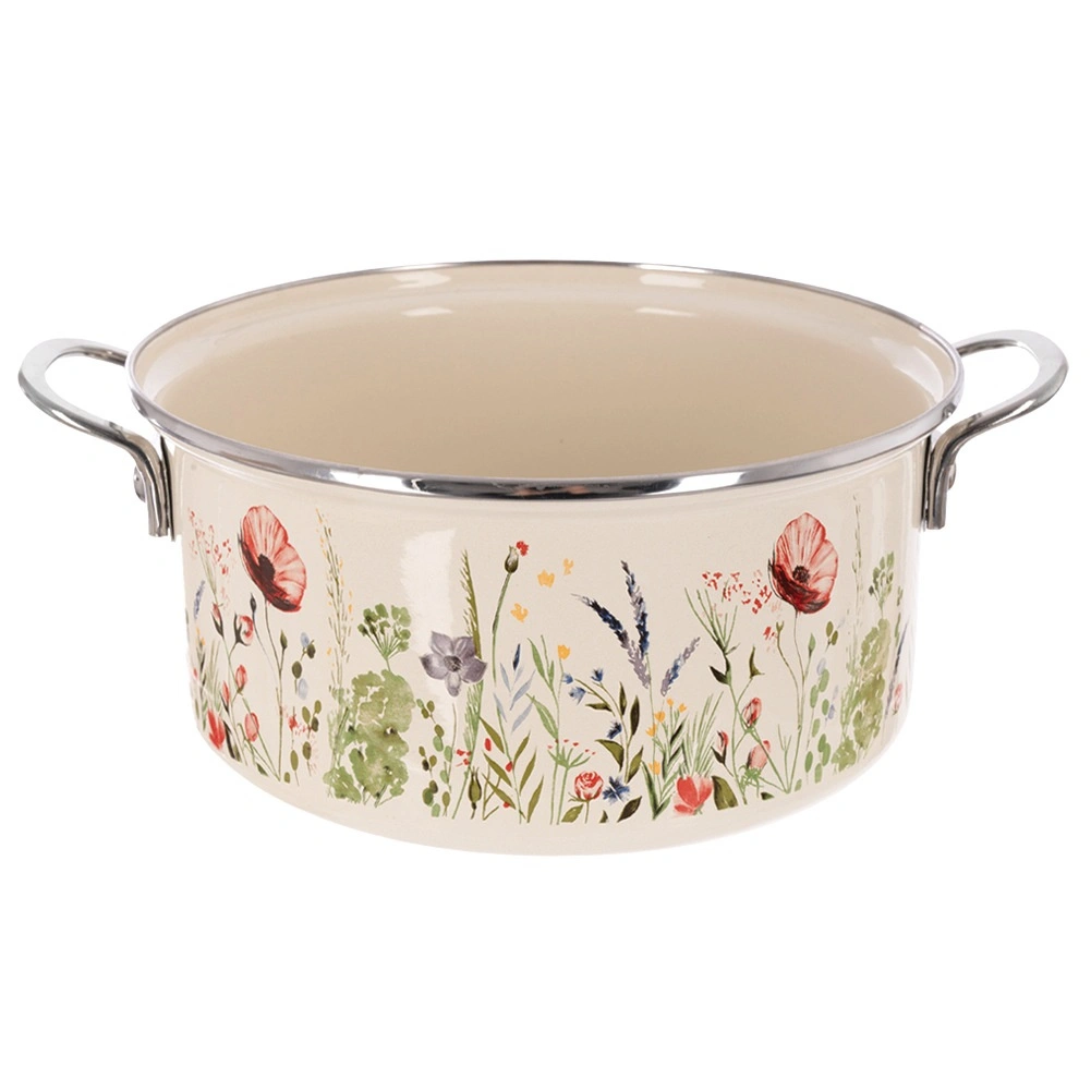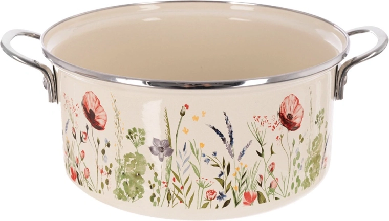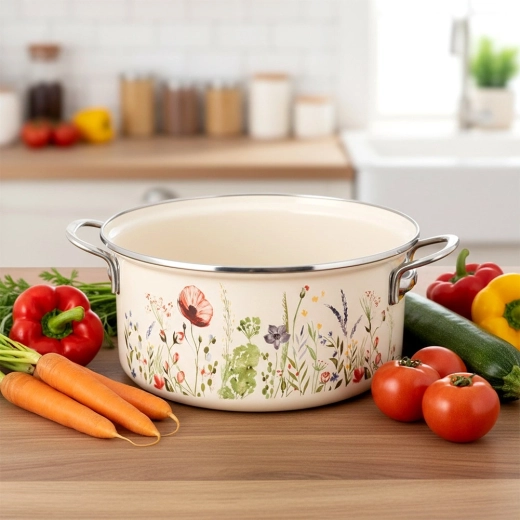 Popularny garnek w stylu retro łączy trwałość emalii z codzienną praktycznością. Pojemność 5 l, średnica 26 cm i wysokość 12 cm zapewniają wystarczająco miejsca na zupy, sosy i rodzinne porcje. Kremowe wykończenie z kwiatowym dekorem ozdobi kuchnię i stół, więc możesz w nim od razu serwować potrawy.