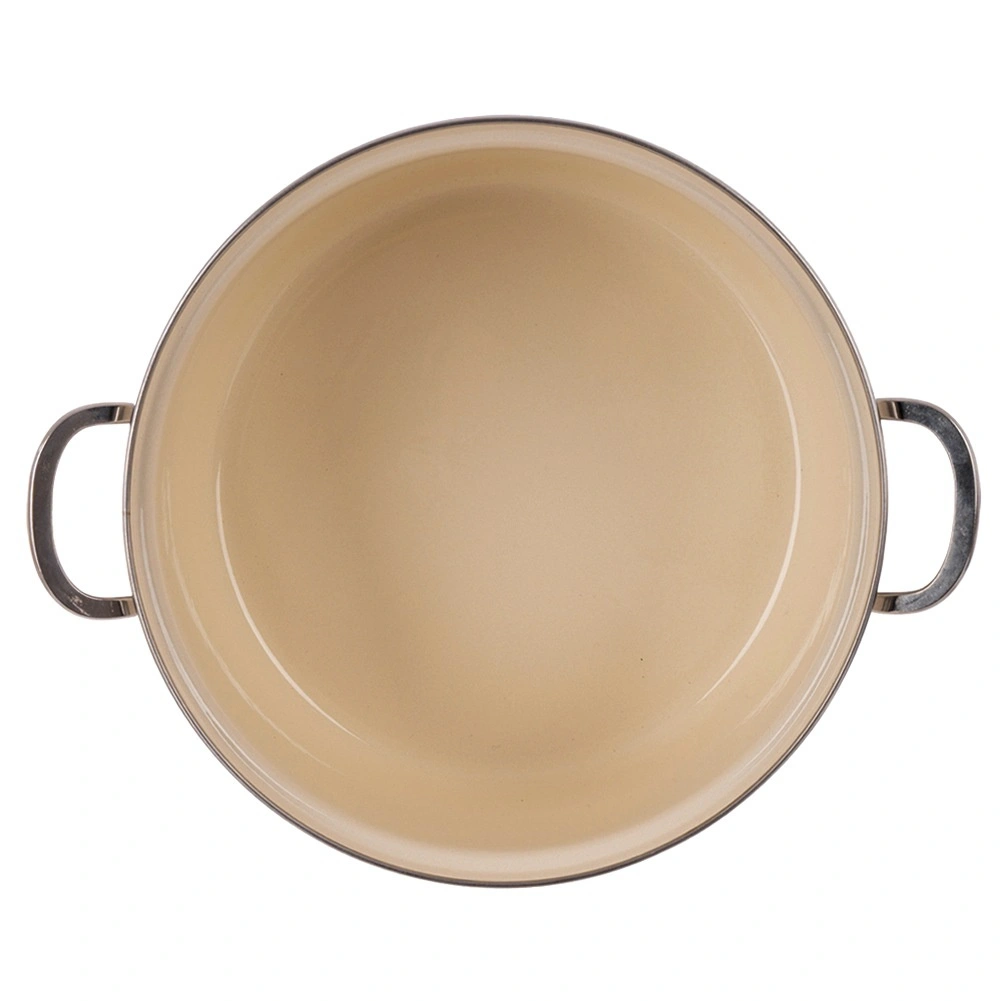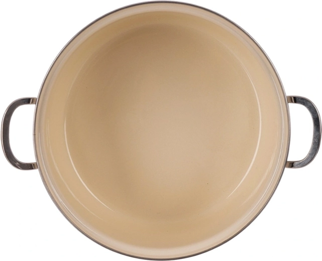 Gładka emalia jest higieniczna i łatwa w czyszczeniu, nierdzewna krawędź i solidne uchwyty zapewniają stabilność oraz długą żywotność.