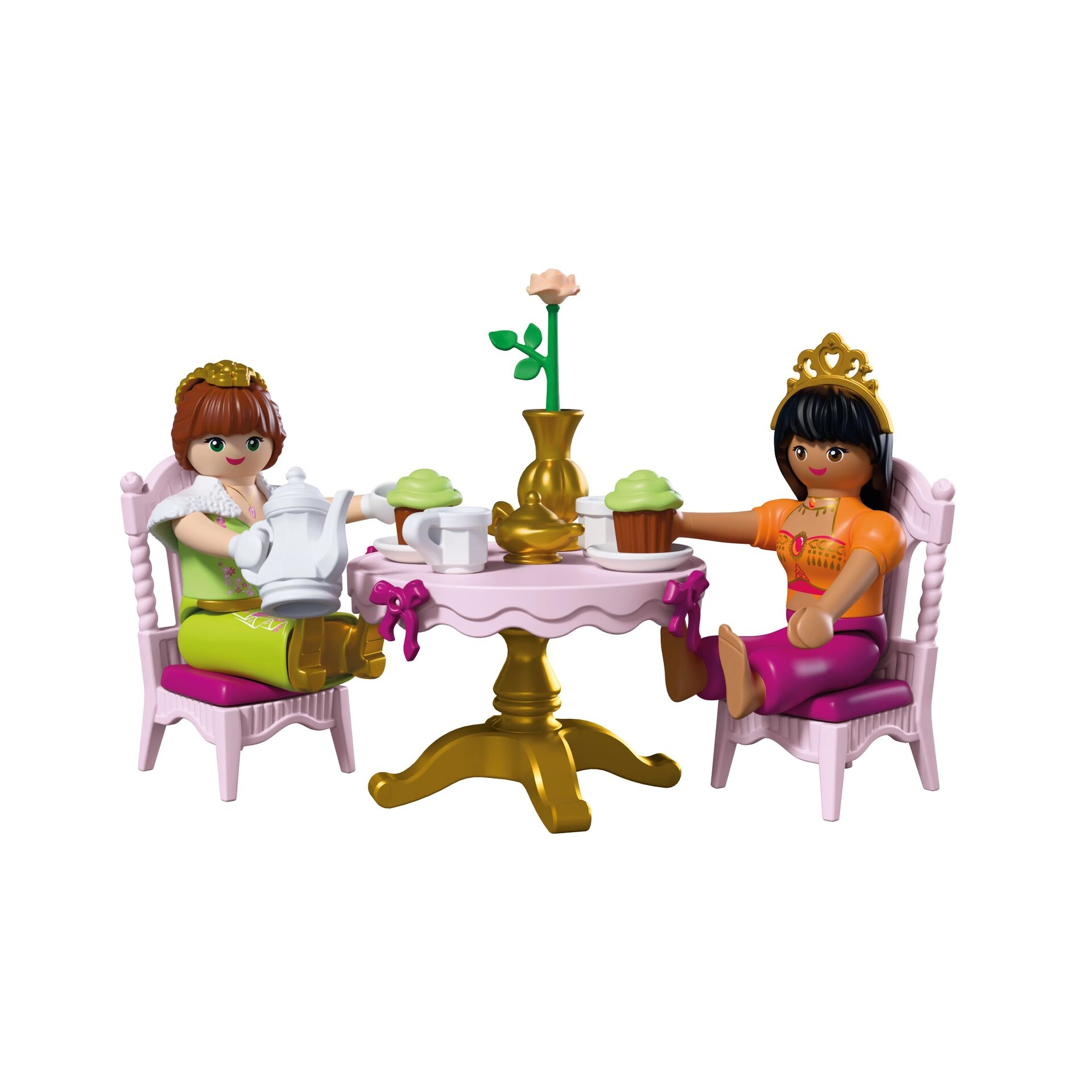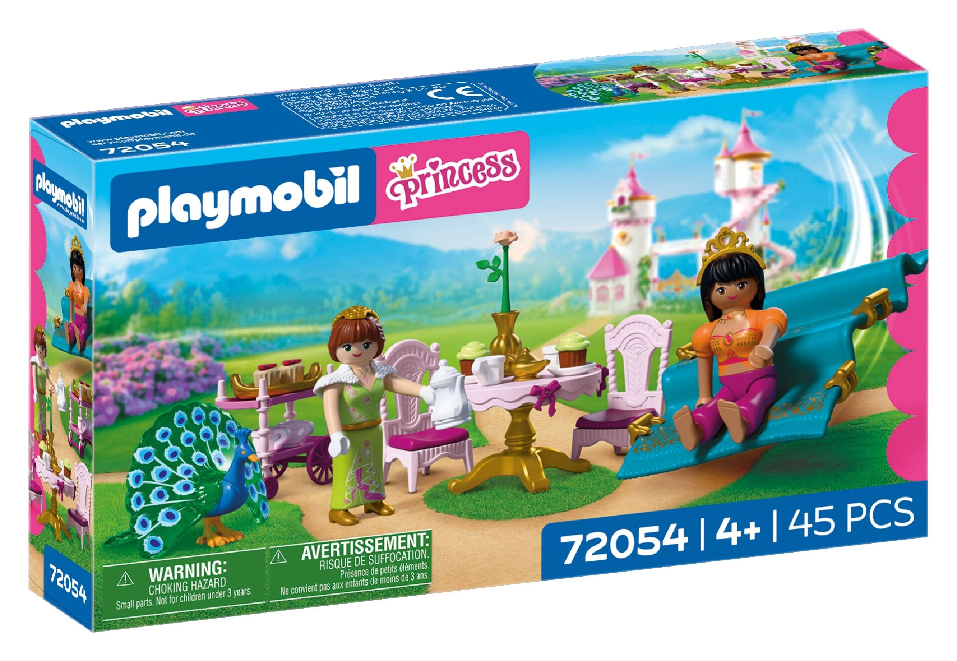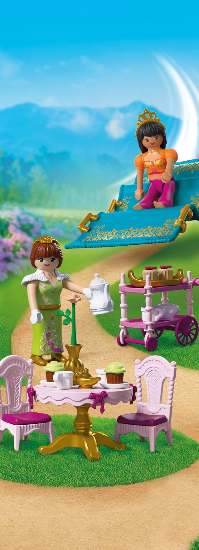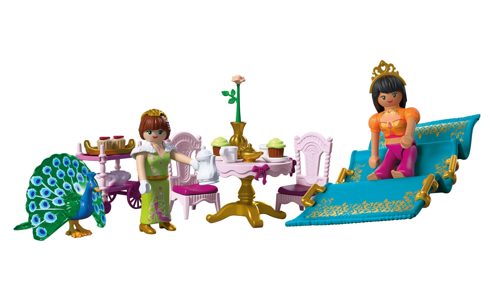 Urokliwy zestaw PLAYMOBIL dla miłośników bajek: dwie księżniczki spędzają popołudnie przy herbacie w ogrodzie pałacowym, przybywają na latającym dywanie i serwują smakołyki ze stolika do serwowania. W zestawie znajduje się elegancki zestaw do herbaty, urocze babeczki oraz majestatyczny paw, by tworzyć jeszcze bardziej fantastyczne opowieści. Zestaw oferuje bogate akcesoria i wspiera kreatywne odgrywanie ról.
