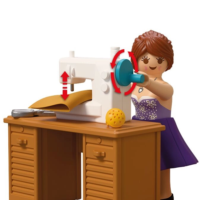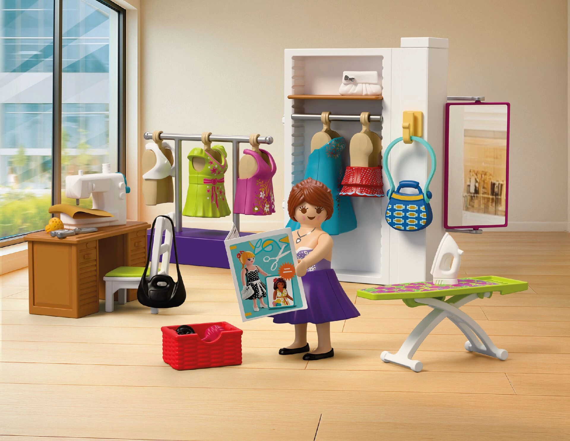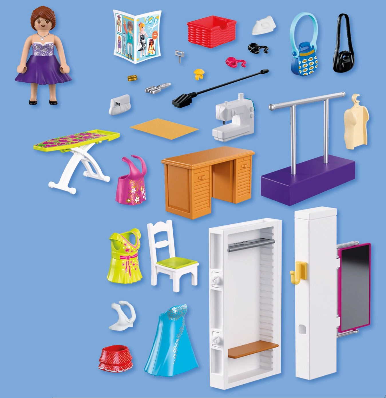 W komplecie znajduje się wszystko, co potrzebne do pełnego modowego atelier: stół, krzesło, tkaniny, nożyczki, igielnik, kłębek wełny, torebki i inne drobiazgi. Zestaw składa się z 64 elementów i można go łączyć z innymi zestawami PLAYMOBIL dla jeszcze bogatszych historii.