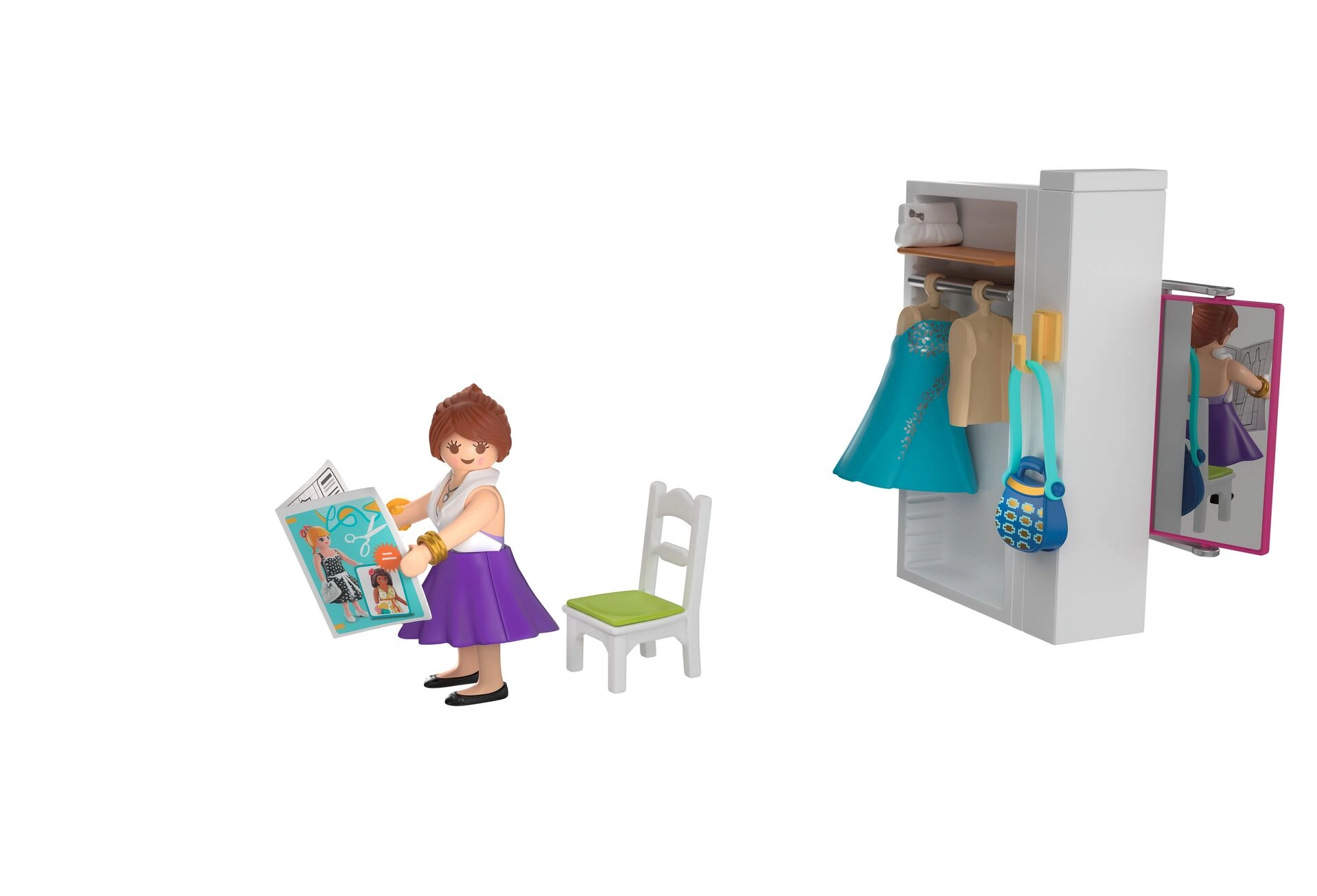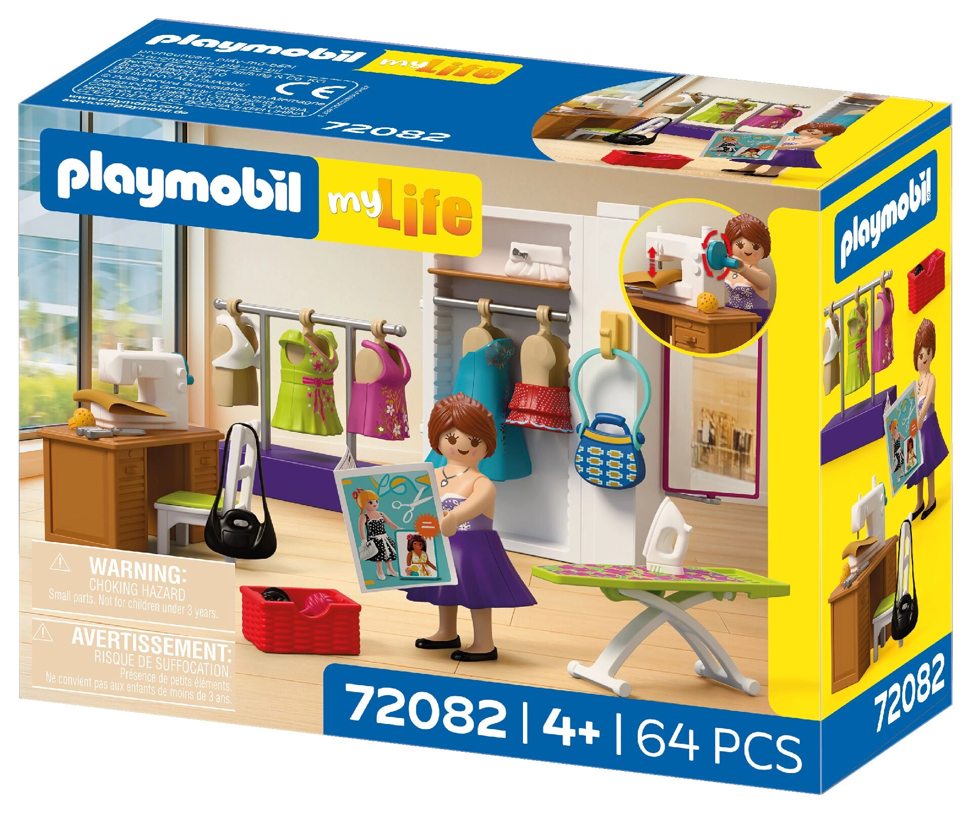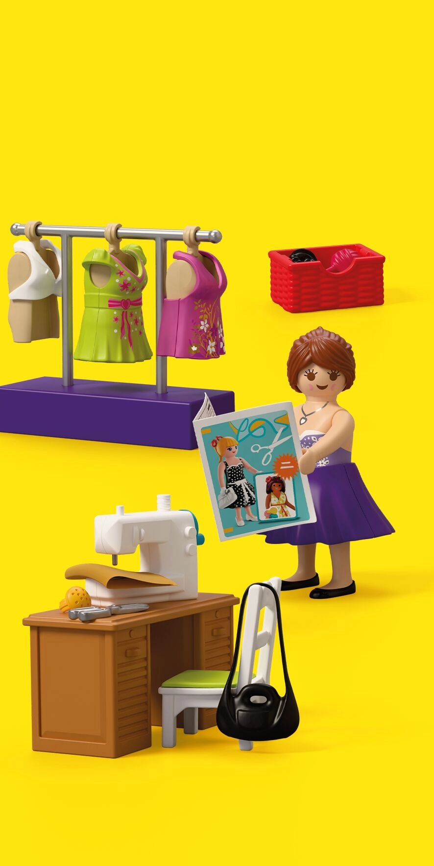 W komplecie znajduje się wszystko, co potrzebne do pełnego modowego atelier: stół, krzesło, tkaniny, nożyczki, igielnik, kłębek wełny, torebki i inne drobiazgi. Zestaw składa się z 64 elementów i można go łączyć z innymi zestawami PLAYMOBIL dla jeszcze bogatszych historii.