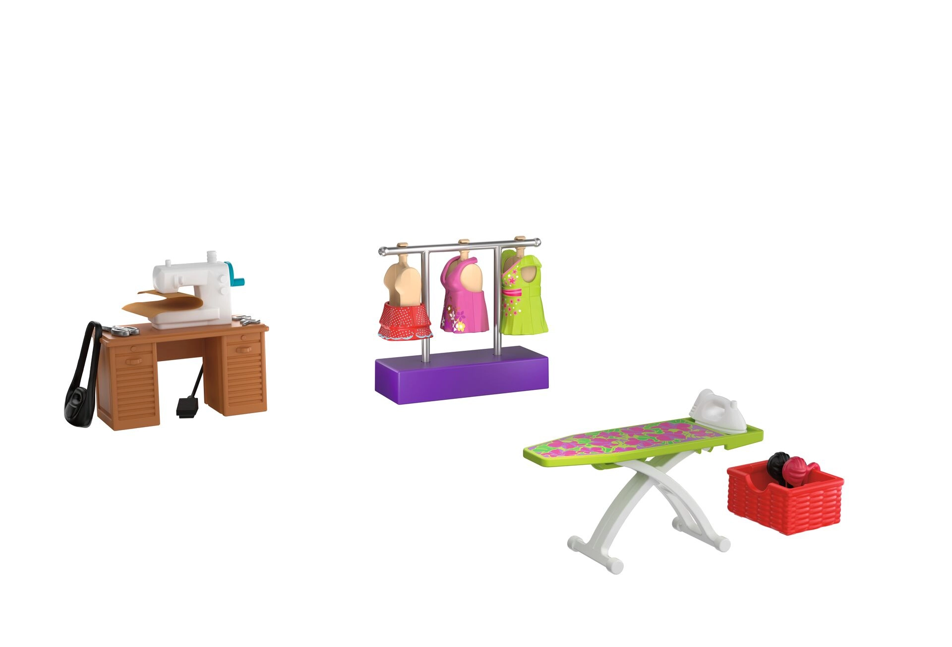 - Figurka projektantki (ok. 7,5 cm), 2 spódnice, 3 sukienki, top, szafa, ruchome lustro, deska do prasowania, żelazko, torebka kopertówka, 2 torby, maszyna do szycia, stół, krzesło, tkanina, nożyczki, arkusz ze wykrojami, kłębek wełny, igielnik, koszyk i inne akcesoria